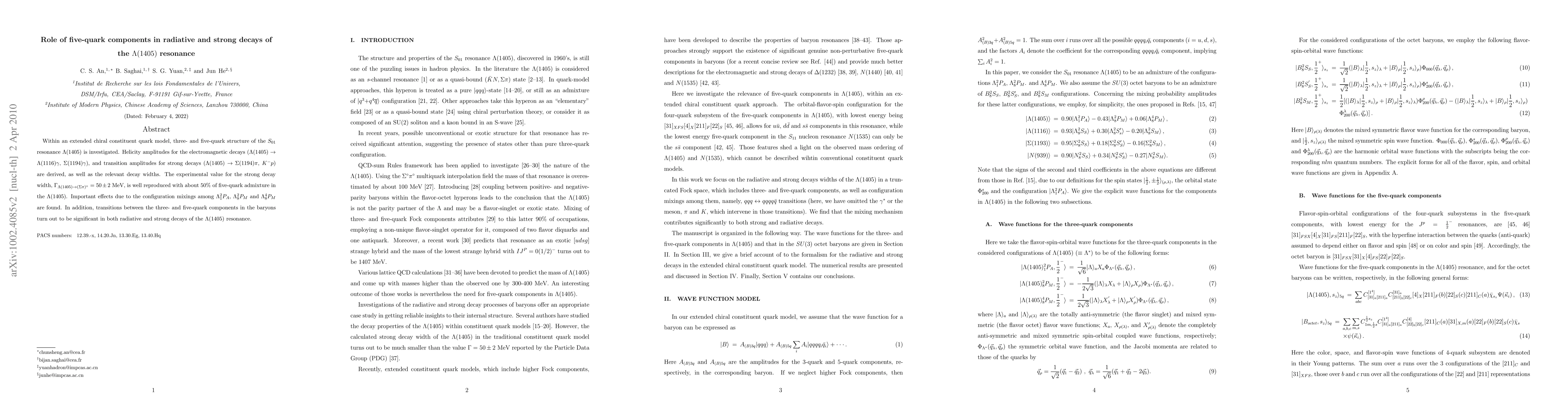 This paper investigates the three- and five-quark structures of the $\Lambda(1405)$ resonance using an extended chiral constituent quark model, finding significant contributions from five-quark components in both radiative and strong decay processes. The model accurately reproduces the experimental decay width, highlighting the importance of configuration mixings and transitions between quark components.