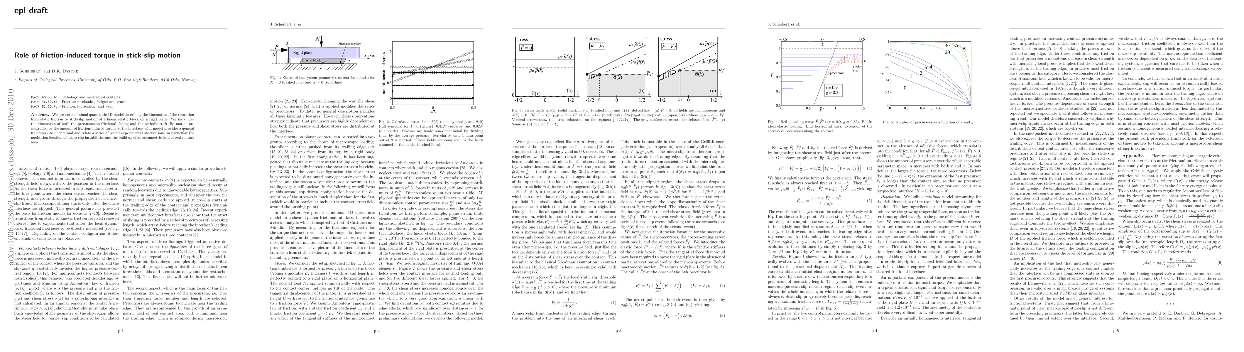 This paper introduces a 1D quasistatic model explaining the transition from static to stick-slip friction, emphasizing the role of friction-induced torque in controlling the kinematics of this motion and relating it to recent experimental observations of micro-slip instabilities and asymmetric contact area.
