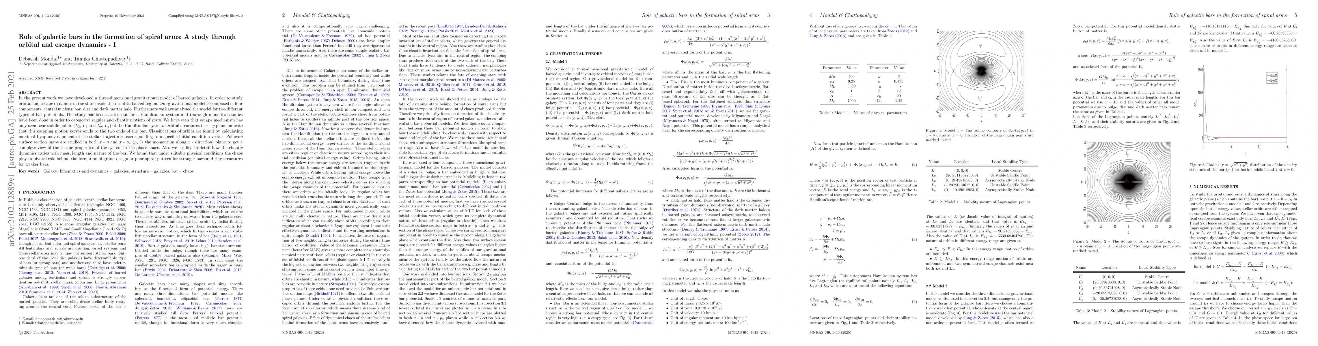 This paper develops a three-dimensional gravitational model of barred galaxies to study the orbital and escape dynamics of stars within the central bar region. It finds that chaos and escape mechanisms near saddle points influence the formation of spiral arms and ring structures, depending on the bar's mass and length.