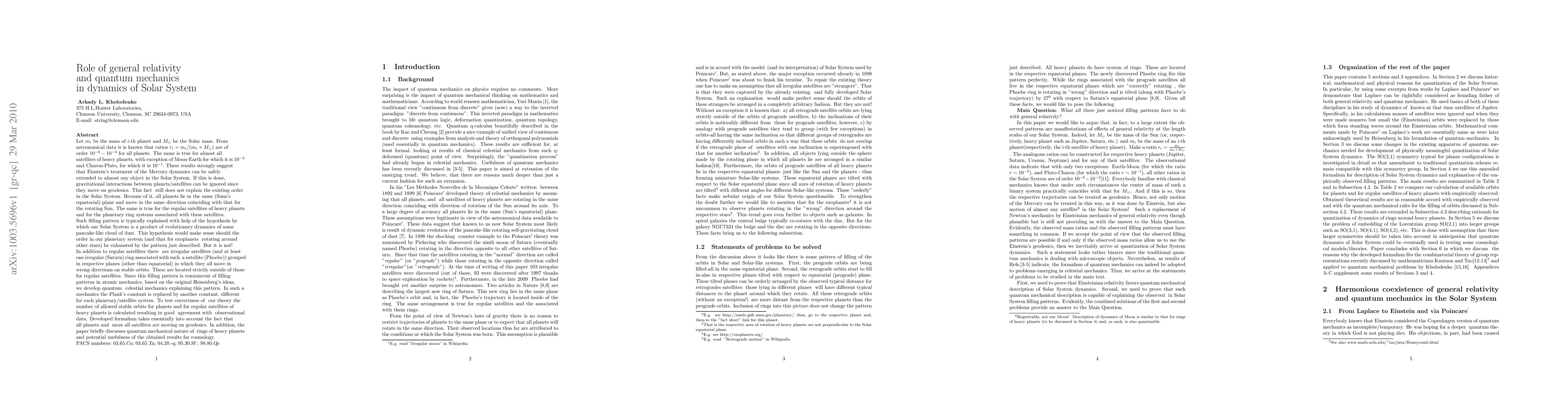 Let m(i) be the mass of i-th planet and M be the Solar mass. From astronomical data it is known that ratios r(i)=m(i)/(m(i)+M) are of order 10^(-3)-10^(-6) for all planets. The same is true for all satellites of heavy planets. These results suggest that Einstein's treatment of Mercury dynamics can be extended to almost any object in the Solar System. This fact does not explain the existing order in the Solar System. Indeed, all planets lie in the same (Sun's equatorial) plane and move in the same direction coinciding with that for the rotating Sun.The same is true for regular satellites of heavy planets and for planetary rings associated with these satellites.In addition to regular satellites, there are irregular satellites (and at least one irregular (Saturn) ring associated with such a satellite (Phoebe)) grouped in respective planes (other than equatorial) in which they all move in "wrong" directions on stable orbits. These are located strictly outside of those for regular satellites. This filling pattern is reminiscent to that in atomic mechanics. Based on the original Heisenberg's ideas, we develop quantum celestial mechanics explaining this filling pattern and that for rings of heavy planets. The formalism takes essentially into account that planets and satellites are moving on geodesics.