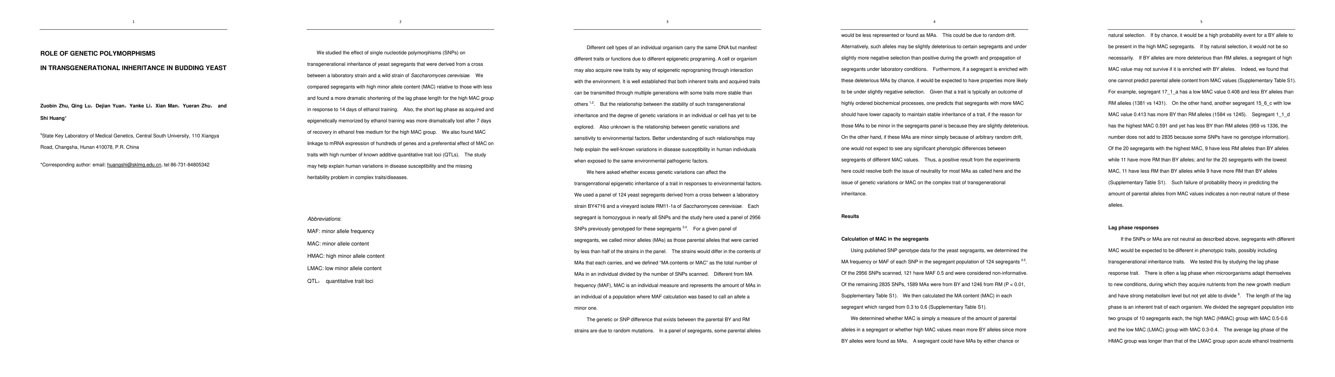 This study investigates how genetic polymorphisms influence transgenerational inheritance in budding yeast, revealing a nonrandom distribution of minor alleles linked to natural selection. High minor allele content correlates with a shorter lag phase in response to ethanol and sodium chloride, suggesting a lower capacity for trait inheritance in these cells, with implications for understanding complex traits and diseases.