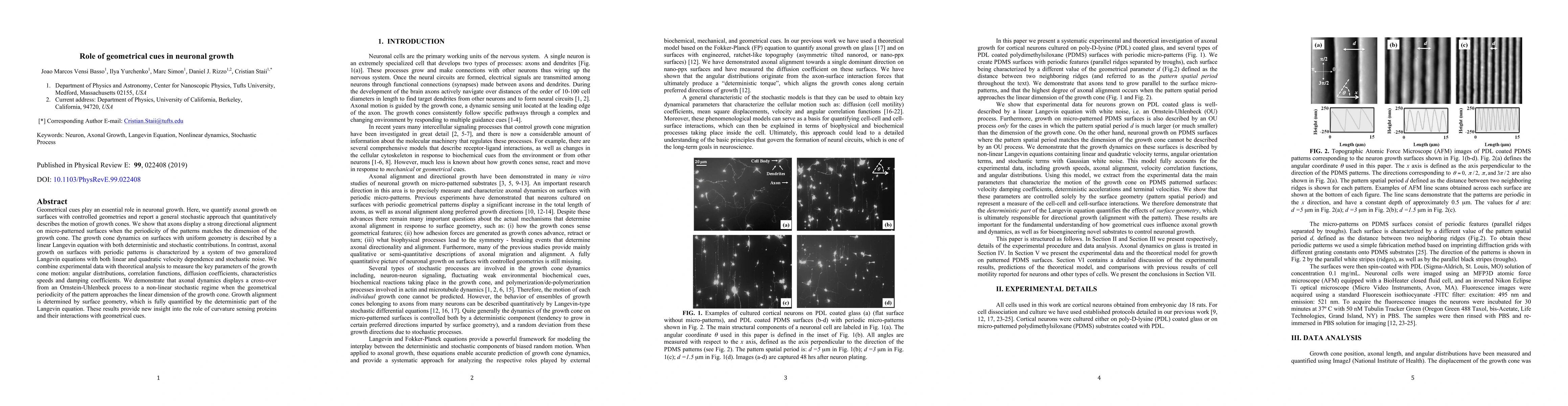 Geometrical cues play an essential role in neuronal growth. Here, we quantify axonal growth on surfaces with controlled geometries and report a general stochastic approach that quantitatively describes the motion of growth cones. We show that axons display a strong directional alignment on micro-patterned surfaces when the periodicity of the patterns matches the dimension of the growth cone. The growth cone dynamics on surfaces with uniform geometry is described by a linear Langevin equation with both deterministic and stochastic contributions. In contrast, axonal growth on surfaces with periodic patterns is characterized by a system of two generalized Langevin equations with both linear and quadratic velocity dependence and stochastic noise. We combine experimental data with theoretical analysis to measure the key parameters of the growth cone motion: angular distributions, correlation functions, diffusion coefficients, characteristics speeds and damping coefficients. We demonstrate that axonal dynamics displays a cross-over from an Ornstein-Uhlenbeck process to a non-linear stochastic regime when the geometrical periodicity of the pattern approaches the linear dimension of the growth cone. Growth alignment is determined by surface geometry, which is fully quantified by the deterministic part of the Langevin equation. These results provide new insight into the role of curvature sensing proteins and their interactions with geometrical cues.