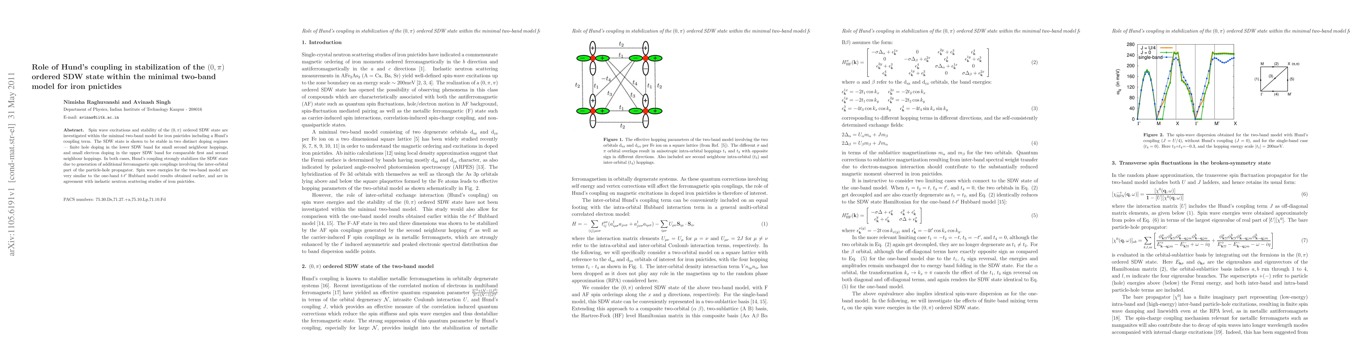 This paper investigates the stabilization of the (0,pi) ordered spin density wave (SDW) state in iron pnictides using a minimal two-band model, highlighting the role of Hund's coupling. The study finds that Hund's coupling significantly stabilizes the SDW state in two doping regimes, generating additional ferromagnetic spin couplings and aligning with experimental neutron scattering data.