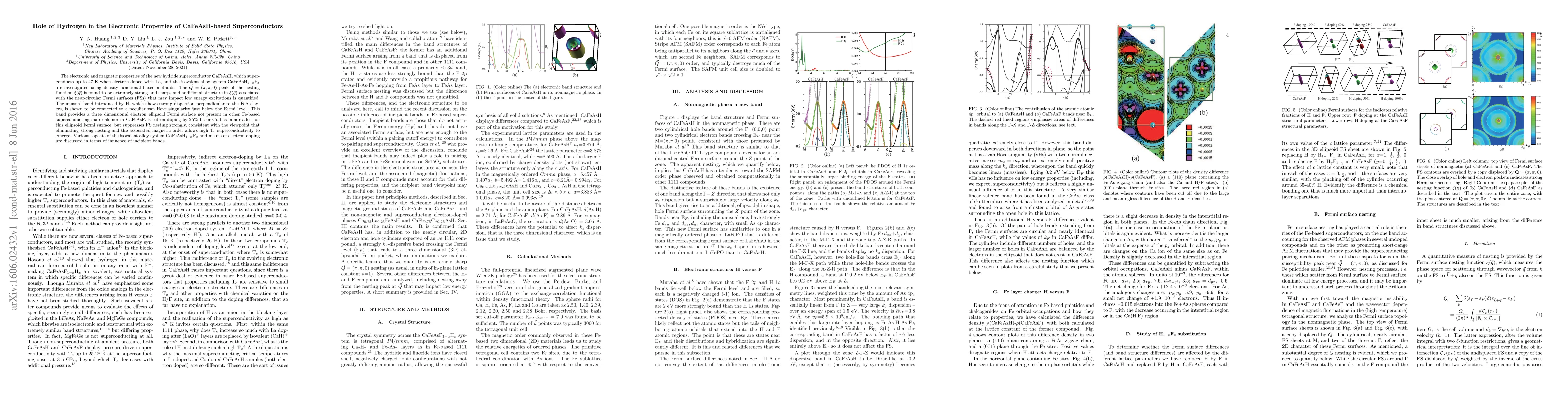 This paper investigates the electronic properties of CaFeAsH superconductors, revealing a unique three-dimensional electron ellipsoid Fermi surface due to the hydrogen band. Electron doping with La or Co suppresses Fermi surface nesting and magnetic order, suggesting that eliminating strong nesting facilitates high-temperature superconductivity.