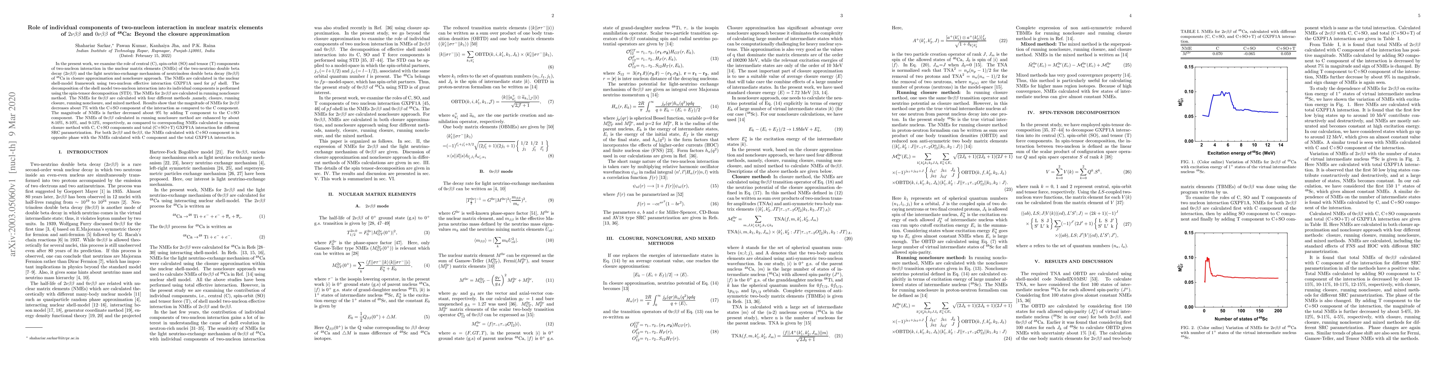 This paper investigates the impact of individual components of two-nucleon interactions on nuclear matrix elements for $2\nu\beta\beta$ and $0\nu\beta\beta$ decays in $^{48}$Ca, beyond the closure approximation. The results show significant variations in decay rates with the inclusion of central, spin-orbit, and tensor components, particularly enhancing $0\nu\beta\beta$ NMEs by 8-12% in nonclosure methods.