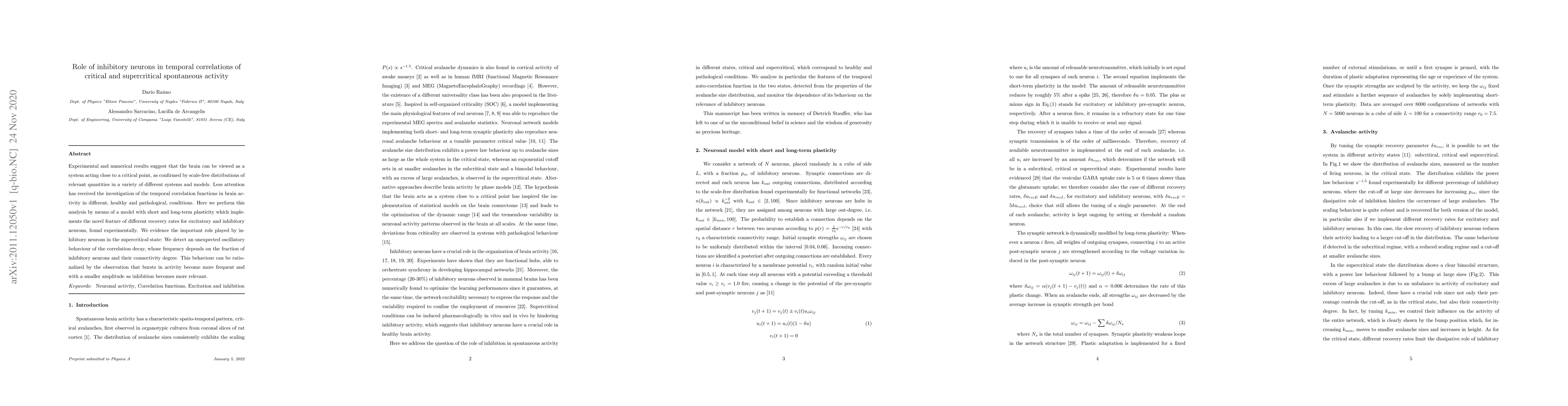 Experimental and numerical results suggest that the brain can be viewed as a system acting close to a critical point, as confirmed by scale-free distributions of relevant quantities in a variety of different systems and models. Less attention has received the investigation of the temporal correlation functions in brain activity in different, healthy and pathological, conditions. Here we perform this analysis by means of a model with short and long-term plasticity which implements the novel feature of different recovery rates for excitatory and inhibitory neurons, found experimentally. We evidence the important role played by inhibitory neurons in the supercritical state: We detect an unexpected oscillatory behaviour of the correlation decay, whose frequency depends on the fraction of inhibitory neurons and their connectivity degree. This behaviour can be rationalized by the observation that bursts in activity become more frequent and with a smaller amplitude as inhibition becomes more relevant.