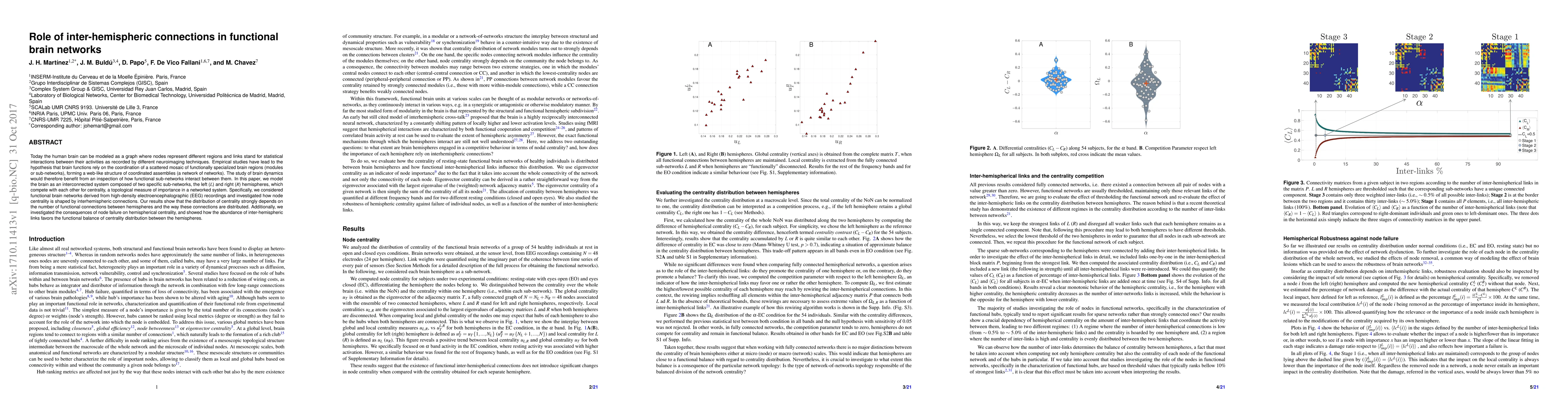 Today the human brain can be modeled as a graph where nodes represent different regions and links stand for statistical interactions between their activities as recorded by different neuroimaging techniques. Empirical studies have lead to the hypothesis that brain functions rely on the coordination of a scattered mosaic of functionally specialized brain regions (modules or sub-networks), forming a web-like structure of coordinated assemblies (a network of networks). The study of brain dynamics would therefore benefit from an inspection of how functional sub-networks interact between them. In this paper, we model the brain as an interconnected system composed of two specific sub-networks, the left (L) and right (R) hemispheres, which compete with each other for centrality, a topological measure of importance in a networked system. Specifically, we consideredfunctional brain networks derived from high-density electroencephalographic (EEG) recordings and investigated how node centrality is shaped by interhemispheric connections. Our results show that the distribution of centrality strongly depends on the number of functional connections between hemispheres and the way these connections are distributed. Additionally, we investigated the consequences of node failure on hemispherical centrality, and showed how the abundance of inter-hemispheric links favors the functional balance of centrality distribution between the hemispheres.