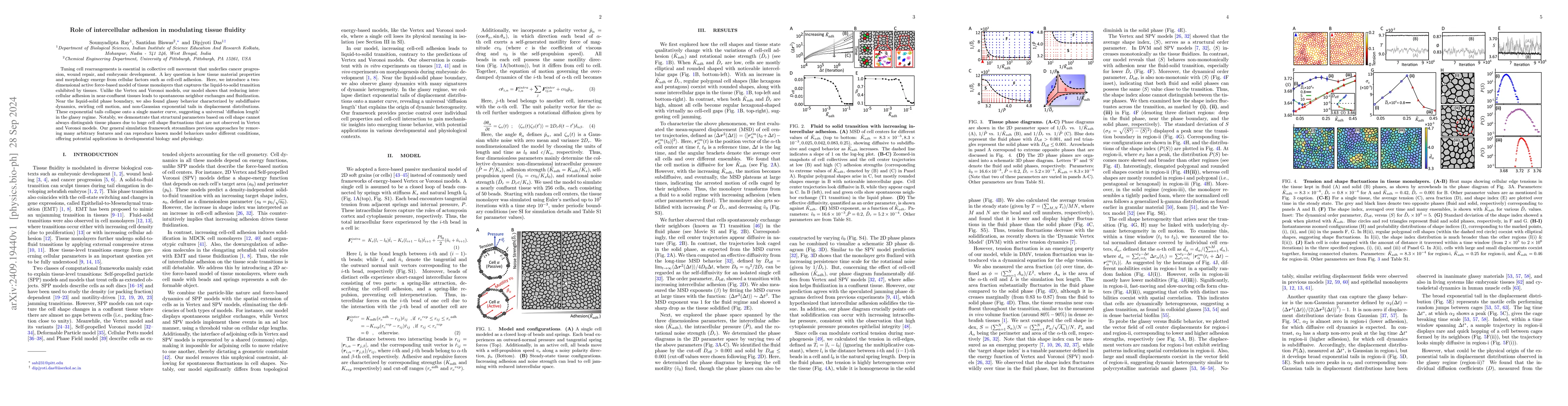 This paper presents a new active force-based model that demonstrates how reducing intercellular adhesion in tissues leads to spontaneous neighbor exchanges and fluidization, revealing glassy behavior and universal diffusion length in the liquid-solid phase boundary. The model simplifies previous approaches and offers insights into tissue material properties and dynamics in biological processes.