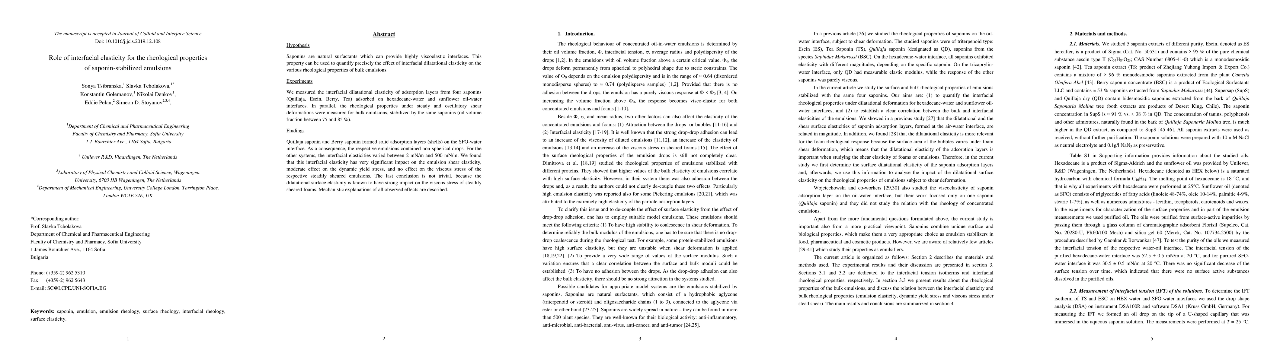 This study investigates how interfacial elasticity from different saponins affects the rheological properties of emulsions. It finds that higher interfacial elasticity significantly impacts emulsion shear elasticity and moderately affects dynamic yield stress, but not viscous stress, despite known effects on foams.