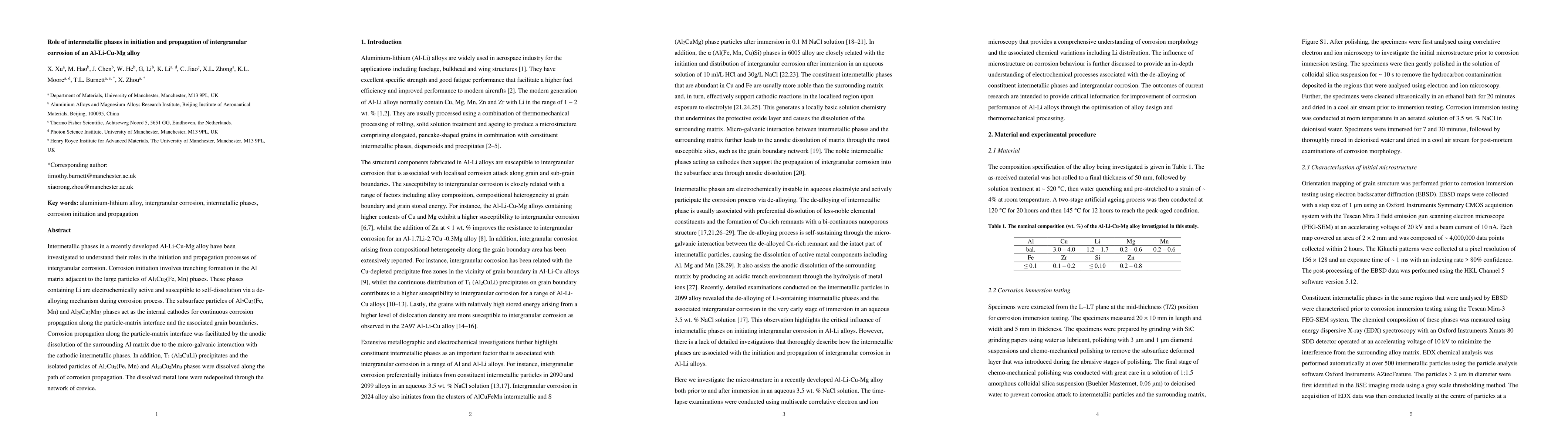 This study investigates the role of intermetallic phases in the initiation and propagation of intergranular corrosion in an Al-Li-Cu-Mg alloy, finding that electrochemically active Al7Cu2(Fe, Mn) phases initiate corrosion by trenching in the Al matrix, while subsurface intermetallics act as internal cathodes for continuous corrosion propagation along particle-matrix interfaces and grain boundaries.