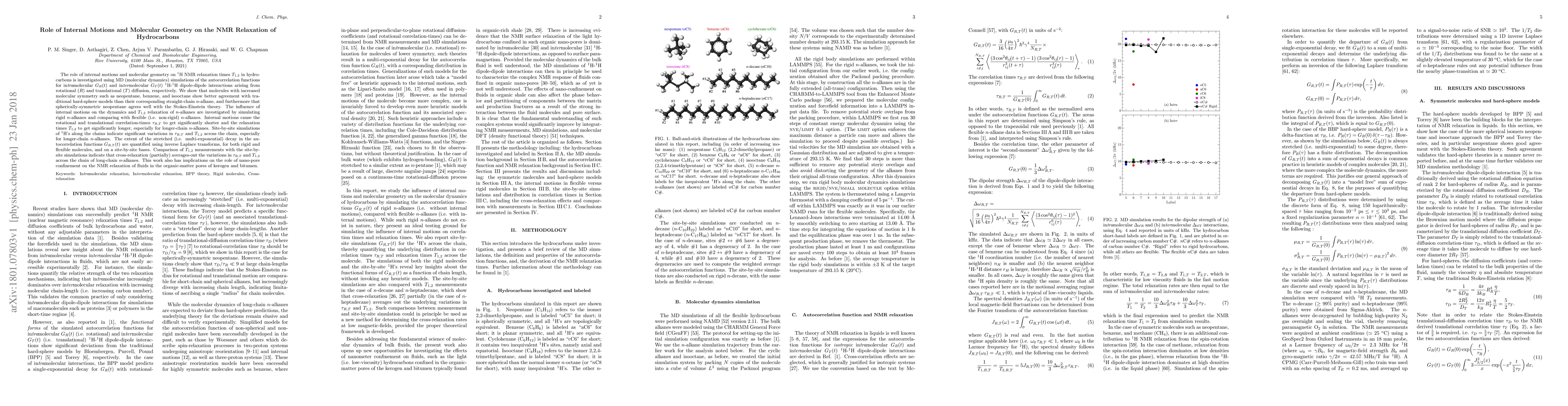 The role of internal motions and molecular geometry on $^1$H NMR relaxation times $T_{1,2}$ in hydrocarbons is investigated using MD (molecular dynamics) simulations of the autocorrelation functions for in{\it tra}molecular $G_R(t)$ and in{\it ter}molecular $G_T(t)$ $^1$H-$^1$H dipole-dipole interactions arising from rotational ($R$) and translational ($T$) diffusion, respectively. We show that molecules with increased molecular symmetry such as neopentane, benzene, and isooctane show better agreement with traditional hard-sphere models than their corresponding straight-chain $n$-alkane, and furthermore that spherically-symmetric neopentane agrees well with the Stokes-Einstein theory. The influence of internal motions on the dynamics and $T_{1,2}$ relaxation of $n$-alkanes are investigated by simulating rigid $n$-alkanes and comparing with flexible (i.e. non-rigid) $n$-alkanes. Internal motions cause the rotational and translational correlation-times $\tau_{R,T}$ to get significantly shorter and the relaxation times $T_{1,2}$ to get significantly longer, especially for longer-chain $n$-alkanes. Site-by-site simulations of $^1$H's along the chains indicate significant variations in $\tau_{R,T}$ and $T_{1,2}$ across the chain, especially for longer-chain $n$-alkanes. The extent of the stretched (i.e. multi-exponential) decay in the autocorrelation functions $G_{R,T}(t)$ are quantified using inverse Laplace transforms, for both rigid and flexible molecules, and on a site-by-site bases. Comparison of $T_{1,2}$ measurements with the site-by-site simulations indicate that cross-relaxation (partially) averages-out the variations in $\tau_{R,T}$ and $T_{1,2}$ across the chain of long-chain $n$-alkanes. This work also has implications on the role of nano-pore confinement on the NMR relaxation of fluids in the organic-matter pores of kerogen and bitumen.