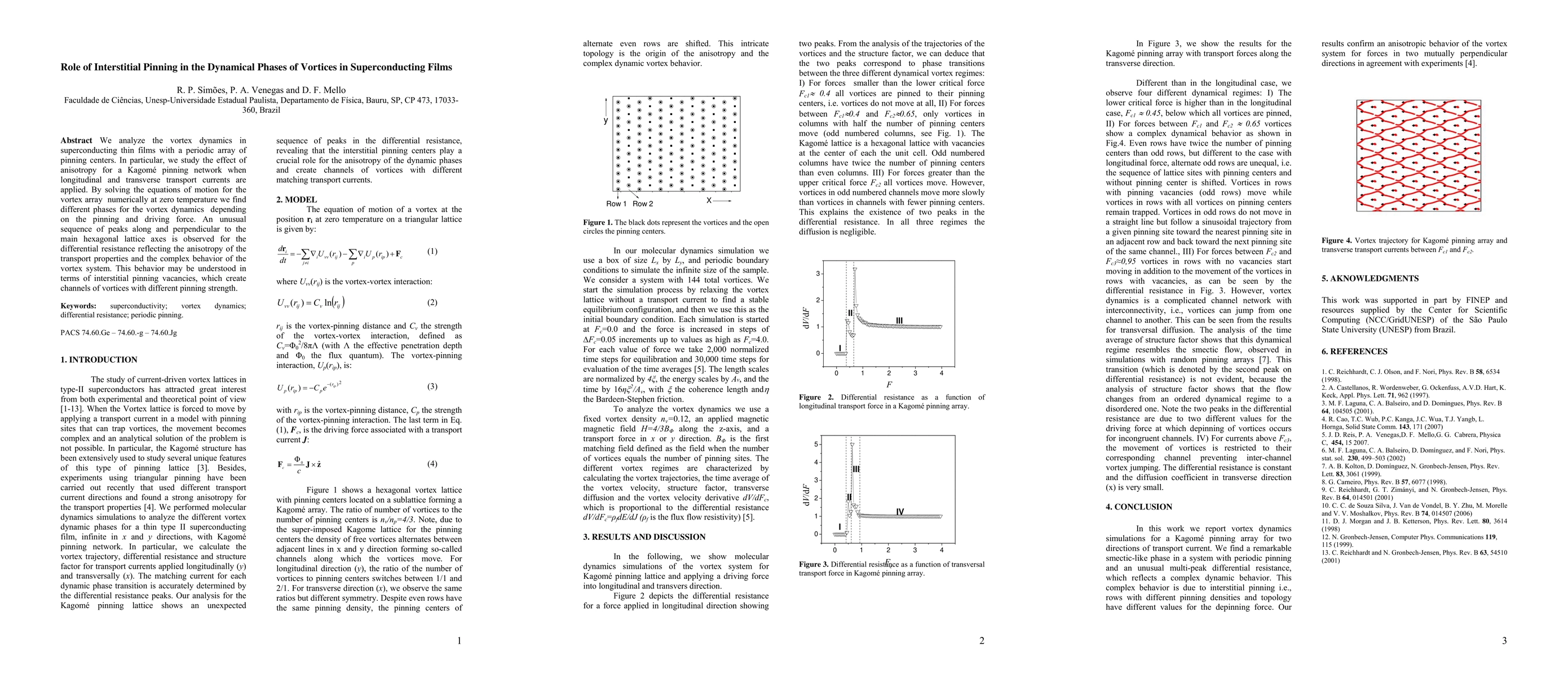 This paper investigates the vortex dynamics in superconducting films with a Kagom\'e pinning network under different transport currents, revealing distinct phases influenced by anisotropy and pinning. The study finds unusual differential resistance peaks reflecting the complex vortex behavior and the role of interstitial pinning vacancies.