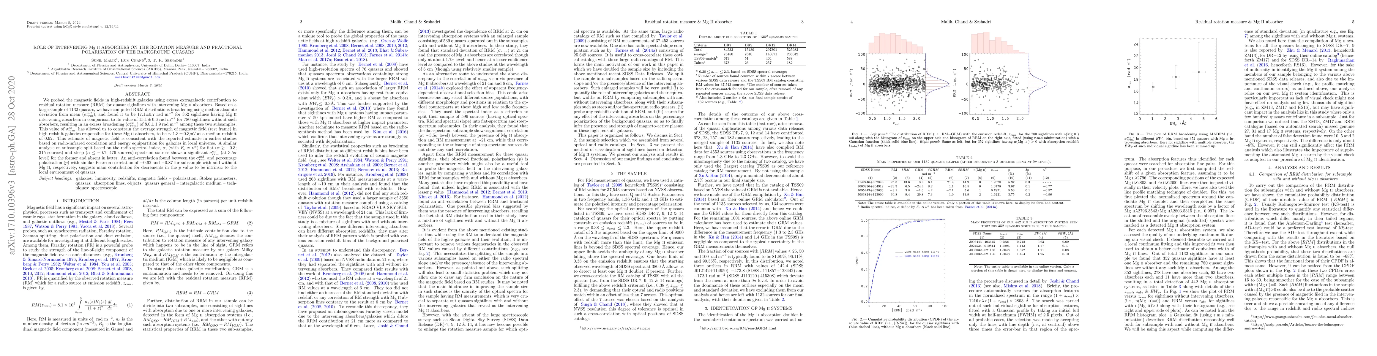 New research reveals that intervening Mg II absorbers in quasars can broaden the rotation measure, indicating a magnetic field strength of around 1.3 microgauss in high-redshift galaxies, consistent with earlier estimates.