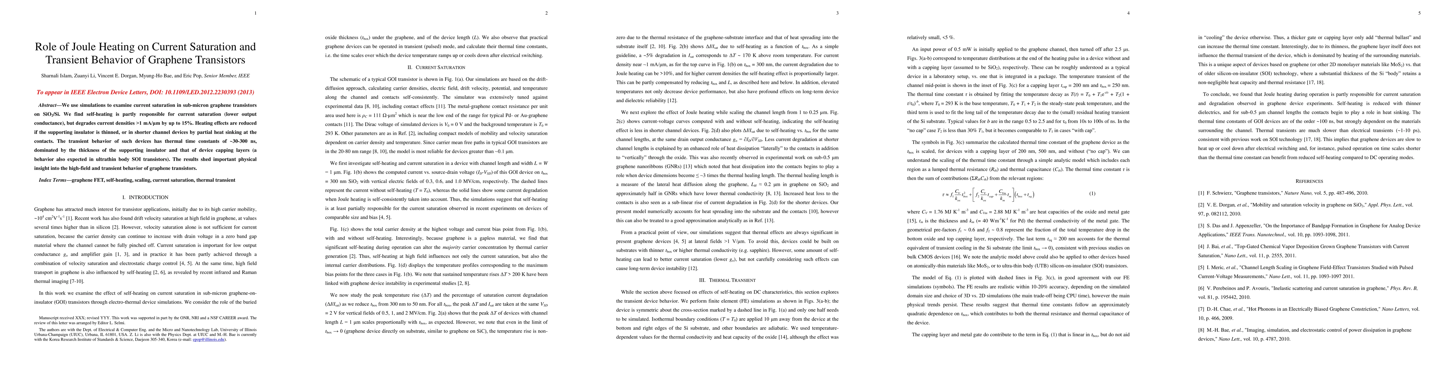 This paper investigates the impact of Joule heating on current saturation and transient behavior in sub-micron graphene transistors. Simulations reveal that self-heating contributes to current saturation but reduces current densities above 1 mA/um by up to 15%, with reduced heating effects in thinner insulators or shorter channels. The transient behavior exhibits thermal time constants of 30-300 ns, influenced by insulator and capping layer thicknesses.