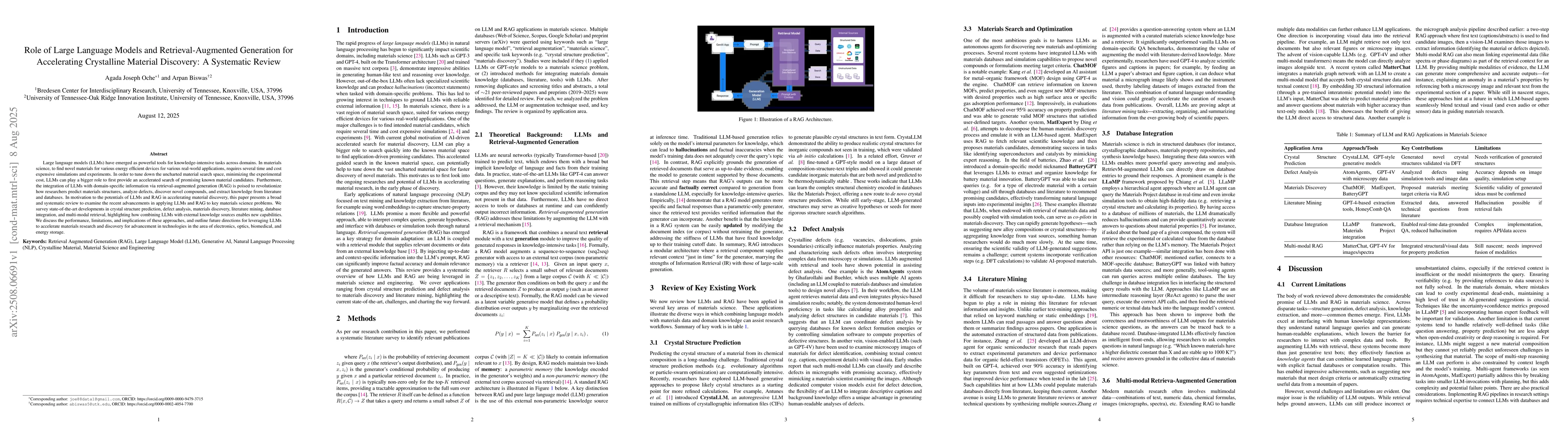 This systematic review examines the application of large language models (LLMs) and retrieval-augmented generation (RAG) in accelerating crystalline material discovery across various tasks including crystal structure prediction, defect analysis, materials discovery, literature mining, database integration, and multi-modal retrieval.