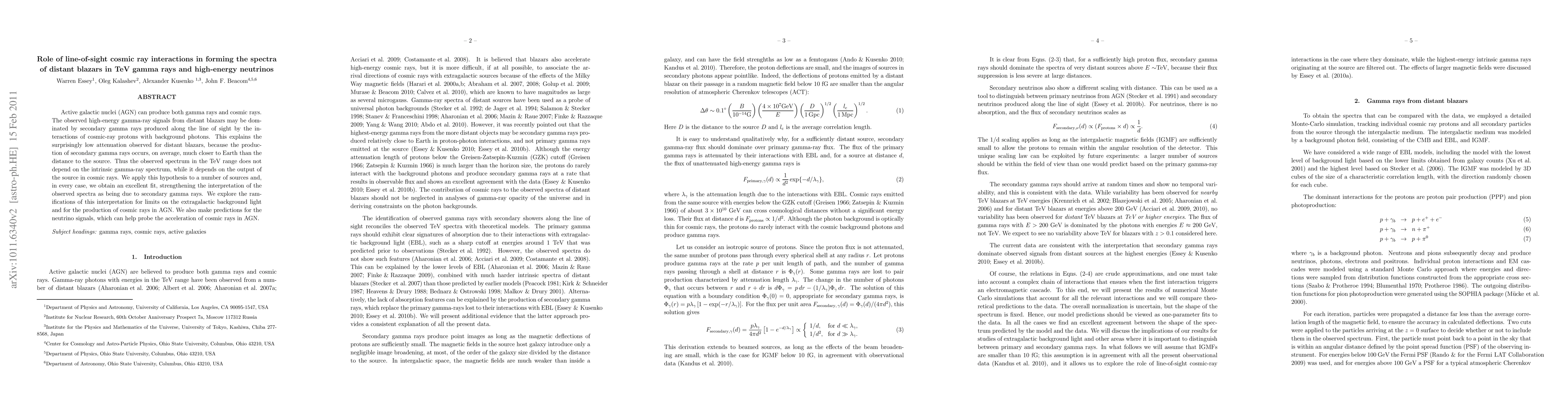Active galactic nuclei (AGN) can produce both gamma rays and cosmic rays. The observed high-energy gamma-ray signals from distant blazars may be dominated by secondary gamma rays produced along the line of sight by the interactions of cosmic-ray protons with background photons. This explains the surprisingly low attenuation observed for distant blazars, because the production of secondary gamma rays occurs, on average, much closer to Earth than the distance to the source. Thus the observed spectrum in the TeV range does not depend on the intrinsic gamma-ray spectrum, while it depends on the output of the source in cosmic rays. We apply this hypothesis to a number of sources and, in every case, we obtain an excellent fit, strengthening the interpretation of the observed spectra as being due to secondary gamma rays. We explore the ramifications of this interpretation for limits on the extragalactic background light and for the production of cosmic rays in AGN. We also make predictions for the neutrino signals, which can help probe acceleration of cosmic rays in AGN.
