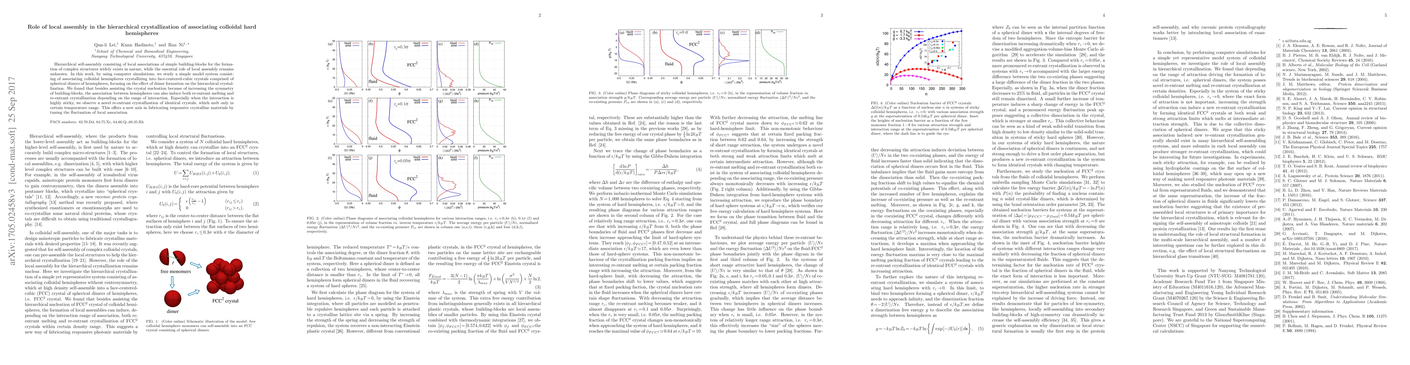 This paper uses computer simulations to explore the role of local assembly in the hierarchical crystallization of colloidal hard hemispheres, finding that dimer formation aids crystal nucleation and can induce re-entrant melting and crystallization, especially under highly sticky interactions, revealing a novel re-entrant crystallization phenomenon. This insight provides a new method for fabricating responsive crystalline materials.