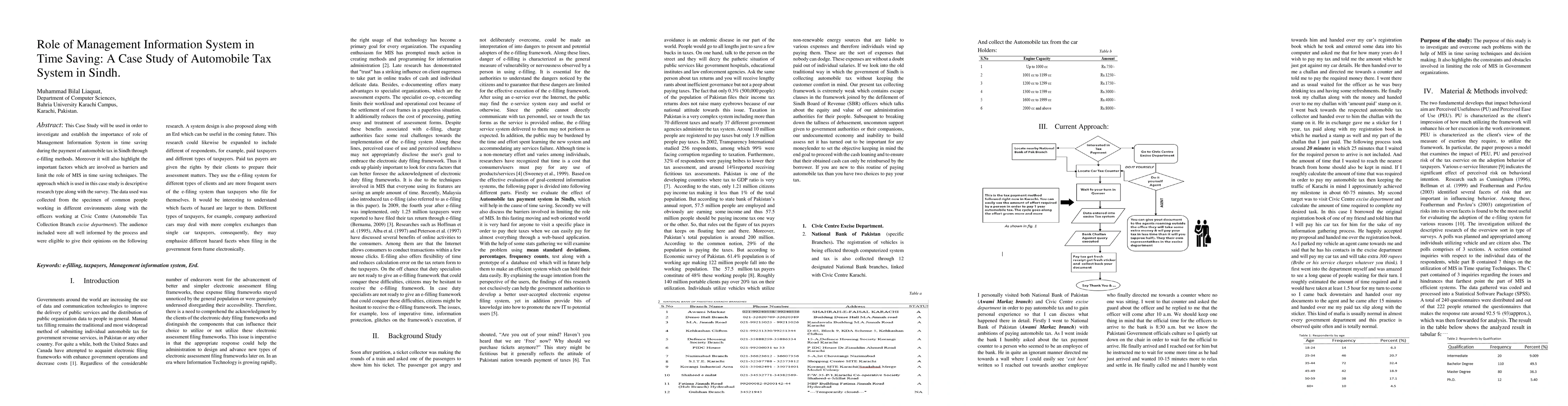 This Case Study will be used in order to investigate and establish the importance of role of Management Information System in time saving during the payment of automobile tax in Sindh through e-filling methods. Moreover it will also highlight the important factors which are involved as barriers and limit the role of MIS in time saving techniques. The approach which is used in this case study is descriptive research type along with the survey. The data used was collected from the specimen of common people working in different environments along with the officers working at Civic Centre (Automobile Tax Collection Branch excise department). The audience included were all well informed by the process and were eligible to give their opinions on the following research. A system design is also proposed along with an Erd which can be useful in the coming future. This research could likewise be expanded to include different of respondents, for example, paid taxpayers and different types of taxpayers. Paid tax payers are given the rights by their clients to prepare their assessment matters. They use the e-filing system for different types of clients and are more frequent users of the e-filing system than taxpayers who file for themselves. It would be interesting to understand which facets of hazard are larger to them. Different types of taxpayers, for example, company authorized cars may deal with more complex exchanges than single car taxpayers, consequently, they may emphasize different hazard facets when filing in the government form frame electronically