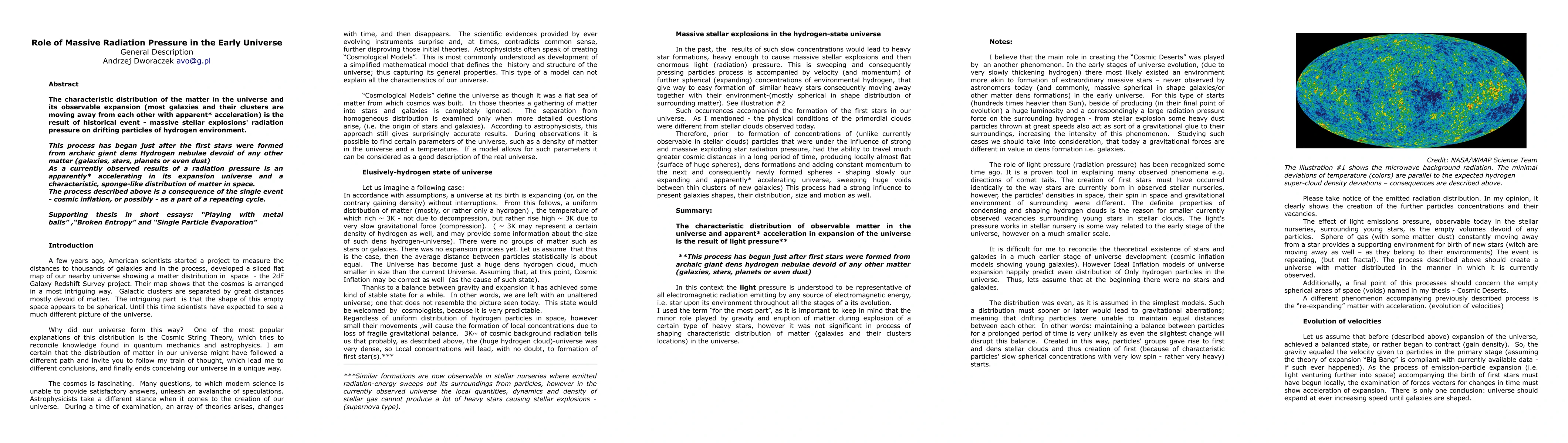Summary: This paper explores how massive radiation pressure from stellar explosions influenced the distribution and expansion of matter in the early universe, particularly affecting drifting hydrogen particles and contributing to the observable acceleration of cosmic expansion.