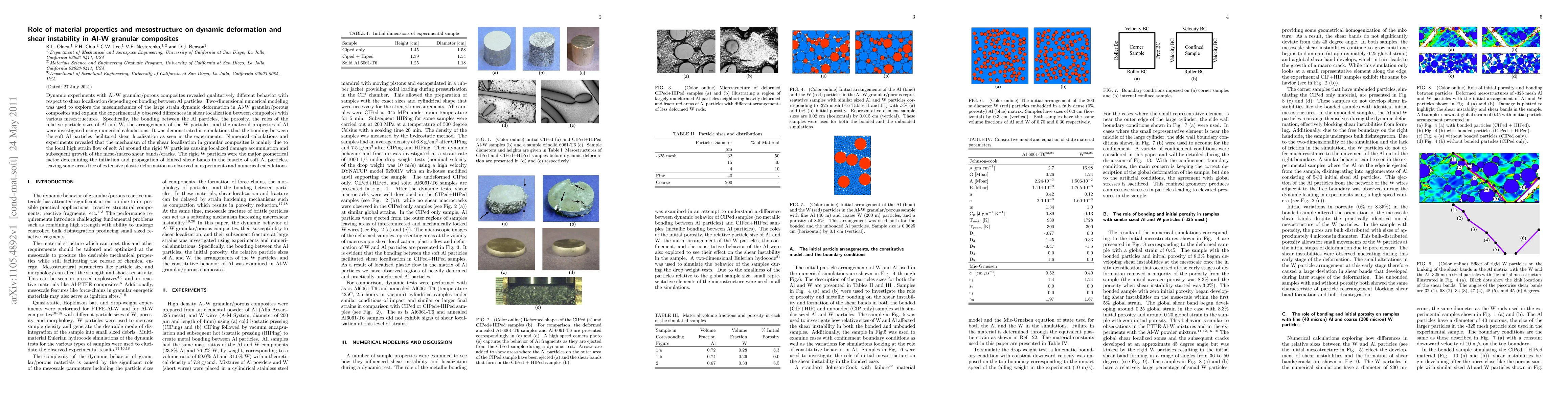 This paper investigates the dynamic deformation and shear instability in Al-W granular composites through experimental and numerical analysis, revealing that bonding between Al particles and the arrangement of W particles significantly influence shear localization. The simulations show that "soft" Al particles' high strain flow around "rigid" W particles leads to localized damage and shear band formation.