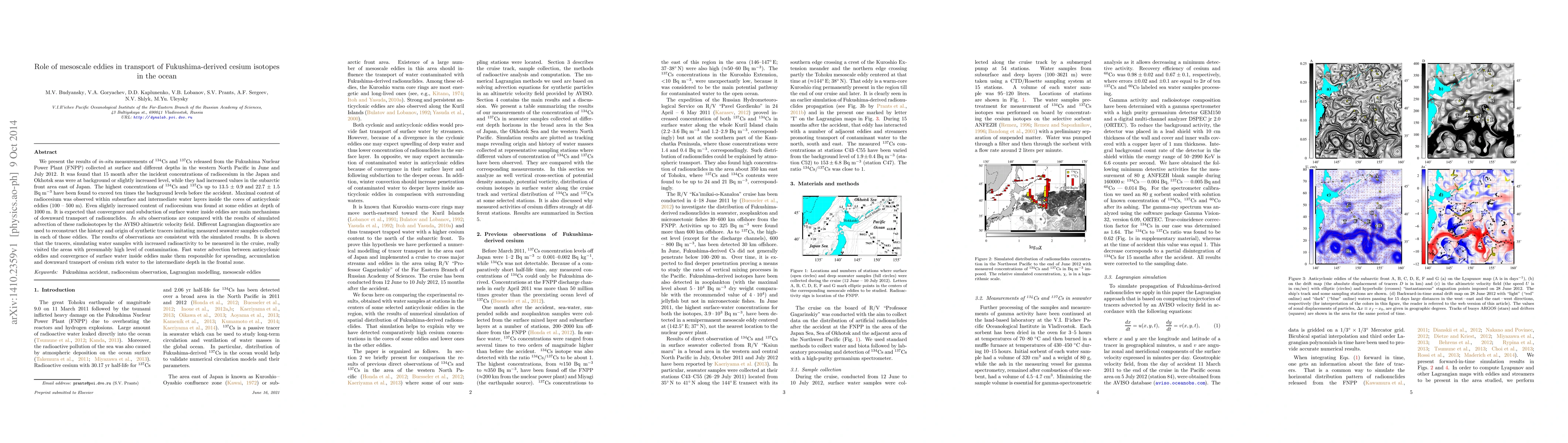 This study investigates the transport of Fukushima-derived cesium isotopes in the western North Pacific, finding that mesoscale eddies significantly facilitate the downward transport and accumulation of radiocesium in subsurface and intermediate water layers. The highest concentrations were observed within anticyclonic eddies, suggesting that eddy-driven convergence and subduction are key mechanisms for spreading and transporting cesium isotopes.