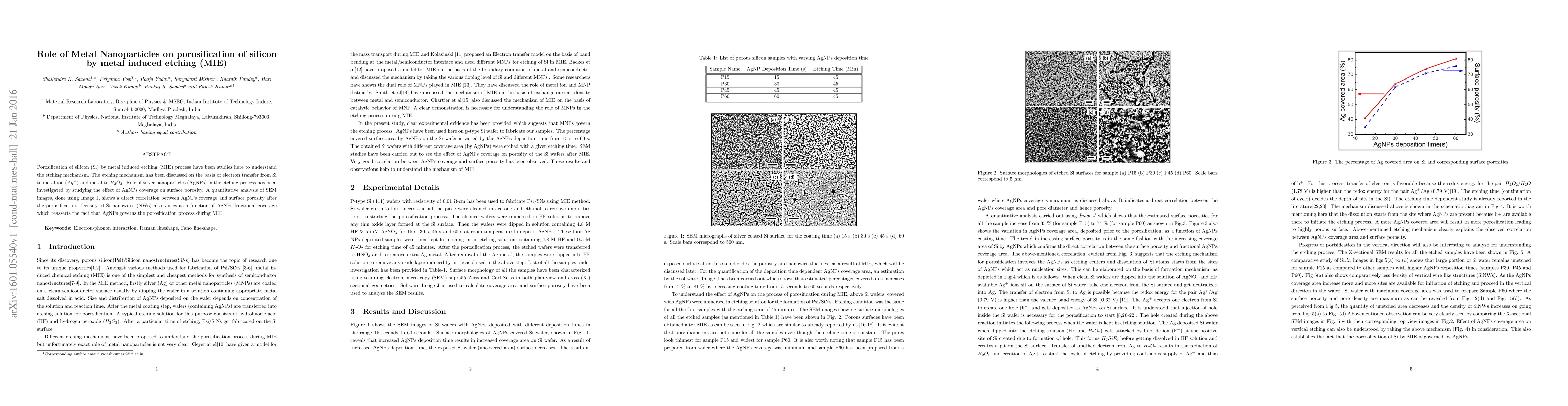 This paper investigates the role of silver nanoparticles in the metal-induced etching (MIE) process for porosifying silicon, revealing a direct correlation between nanoparticle coverage and surface porosity via SEM analysis. The study highlights that silver nanoparticles govern the porosification mechanism through electron transfer processes.