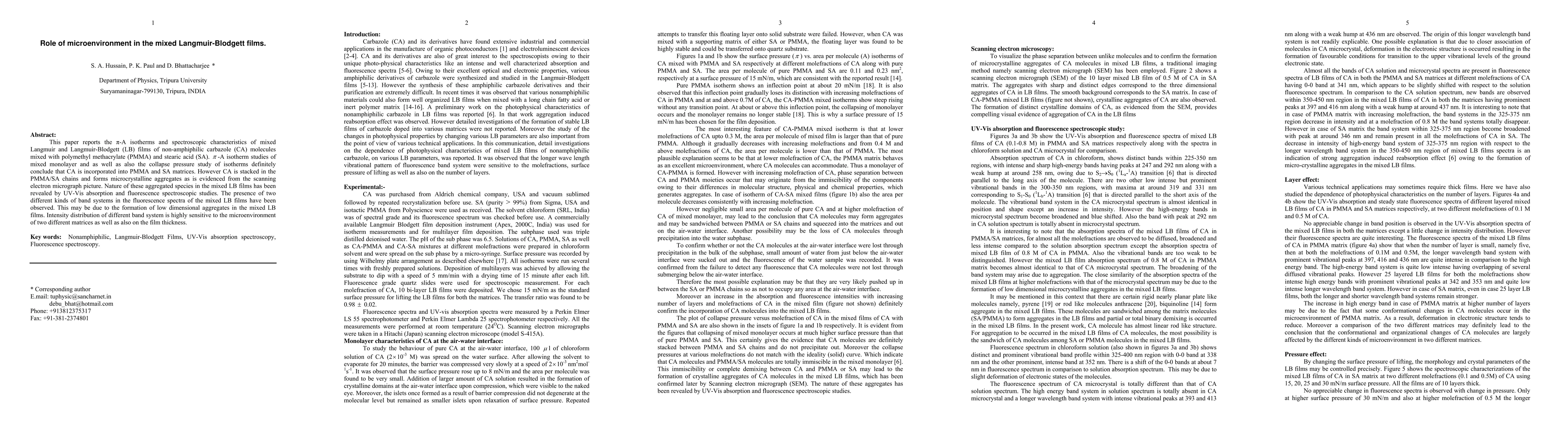 This paper reports the pi-A isotherms and spectroscopic characteristics of mixed Langmuir and Langmuir-Blodgett (LB) films of non-amphiphilic carbazole (CA) molecules mixed with polymethyl methacrylate (PMMA) and stearic acid (SA). pi-A isotherm studies of mixed monolayer and as well as also the collapse pressure study of isotherms definitely conclude that CA is incorporated into PMMA and SA matrices. However CA is stacked in the PMMA/SA chains and forms microcrystalline aggregates as is evidenced from the scanning electron micrograph picture. Nature of these aggregated species in the mixed LB films has been revealed by UV-Vis absorption and fluorescence spectroscopic studies. The presence of two different kinds of band systems in the fluorescence spectra of the mixed LB films have been observed. This may be due to the formation of low dimensional aggregates in the mixed LB films. Intensity distribution of different band system is highly sensitive to the microenvironment of two different matrices as well as also on the film thickness