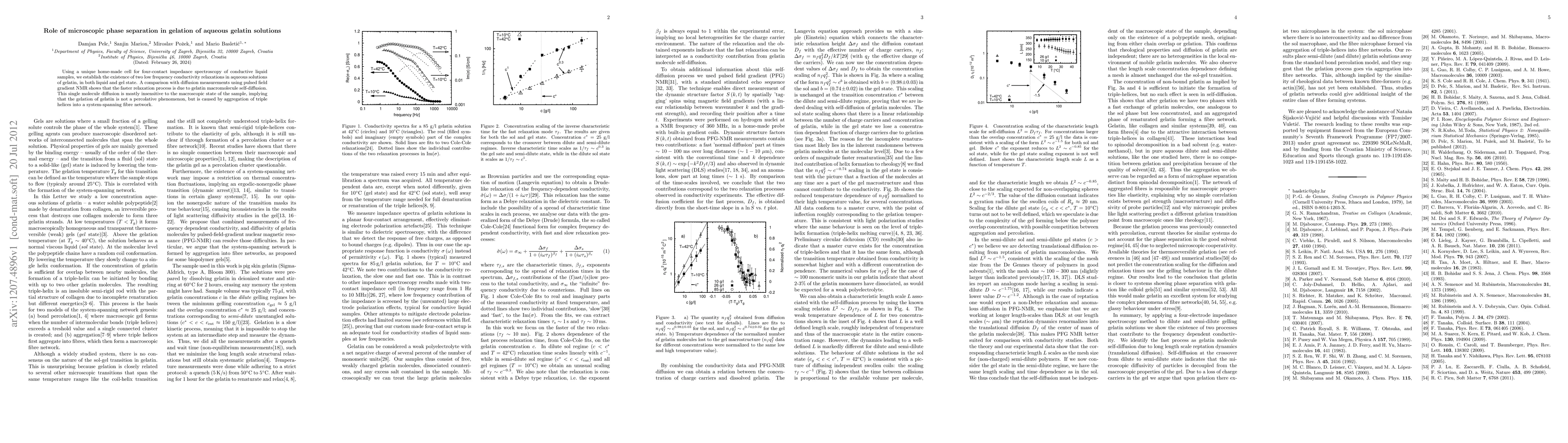 Using a unique home-made cell for four-contact impedance spectroscopy of conductive liquid samples, we establish the existence of two low frequency conductivity relaxations in aqueous solutions of gelatin, in both liquid and gel state. A comparison with diffusion measurements using pulsed field gradient NMR shows that the faster relaxation process is due to gelatin macromolecule self-diffusion. This single molecule diffusion is mostly insensitive to the macroscopic state of the sample, implying that the gelation of gelatin is not a percolative phenomenon, but is caused by aggregation of triple helices into a system-spanning fibre network.