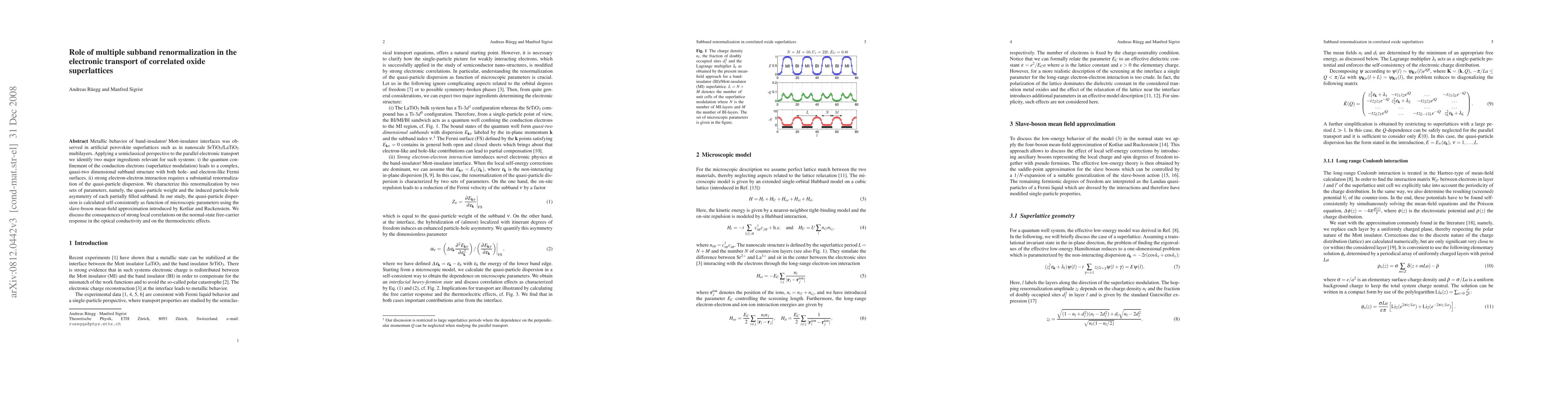 Metallic behavior of band-insulator/ Mott-insulator interfaces was observed in artificial perovskite superlattices such as in nanoscale SrTiO3/LaTiO3 multilayers. Applying a semiclassical perspective to the parallel electronic transport we identify two major ingredients relevant for such systems: i) the quantum confinement of the conduction electrons (superlattice modulation) leads to a complex, quasi-two dimensional subband structure with both hole- and electron-like Fermi surfaces. ii) strong electron-electron interaction requires a substantial renormalization of the quasi-particle dispersion. We characterize this renormalization by two sets of parameters, namely, the quasi-particle weight and the induced particle-hole asymmetry of each partially filled subband. In our study, the quasi-particle dispersion is calculated self-consistently as function of microscopic parameters using the slave-boson mean-field approximation introduced by Kotliar and Ruckenstein. We discuss the consequences of strong local correlations on the normal-state free-carrier response in the optical conductivity and on the thermoelectric effects.