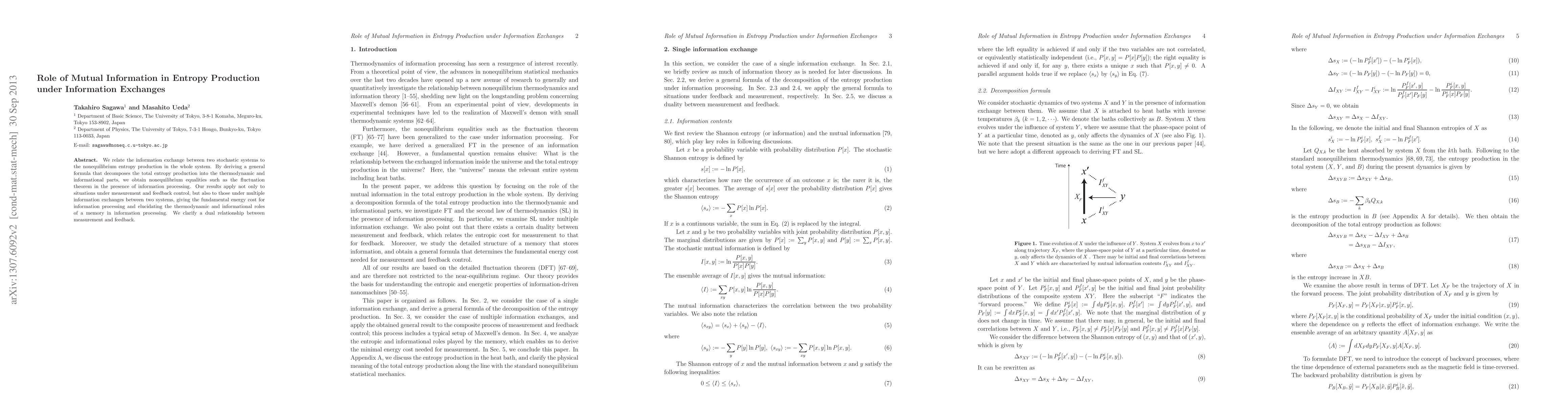 We relate the information exchange between two stochastic systems to the nonequilibrium entropy production in the whole system. By deriving a general formula that decomposes the total entropy production into the thermodynamic and informational parts, we obtain nonequilibrium equalities such as the fluctuation theorem in the presence of information processing. Our results apply not only to situations under measurement and feedback control, but also to those under multiple information exchanges between two systems, giving the fundamental energy cost for information processing and elucidating the thermodynamic and informational roles of a memory in information processing. We clarify a dual relationship between measurement and feedback.