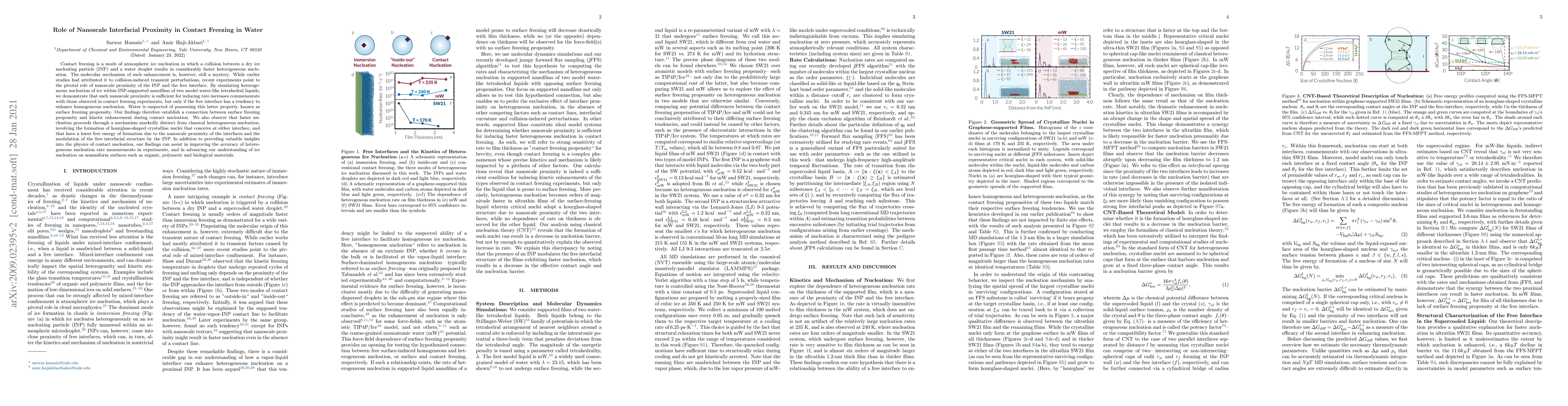 Contact freezing is a mode of atmospheric ice nucleation in which a collision between a dry ice nucleating particle (INP) and a water droplet results in considerably faster heterogeneous nucleation. The molecular mechanism of such enhancement is, however, still a mystery. While earlier studies had attributed it to collision-induced transient perturbations, recent experiments point to the pivotal role of nanoscale proximity of the INP and the free interface. By simulating heterogeneous nucleation of ice within INP-supported nanofilms of two model water-like tetrahedral liquids, we demonstrate that such nanoscale proximity is sufficient for inducing rate increases commensurate with those observed in contact freezing experiments, but only if the free interface has a tendency to enhance homogeneous nucleation. Water is suspected of possessing this latter property, known as surface freezing propensity. Our findings therefore establish a connection between surface freezing propensity and kinetic enhancement during contact nucleation. We also observe that faster nucleation proceeds through a mechanism markedly distinct from classical heterogeneous nucleation, involving the formation of hourglass-shaped crystalline nuclei that conceive at either interface, and that have a lower free energy of formation due to the nanoscale proximity of the interfaces and the modulation of the free interfacial structure by the INP. In addition to providing valuable insights into the physics of contact nucleation, our findings can assist in improving the accuracy of heterogeneous nucleation rate measurements in experiments, and in advancing our understanding of ice nucleation on nonuniform surfaces such as organic, polymeric and biological materials.