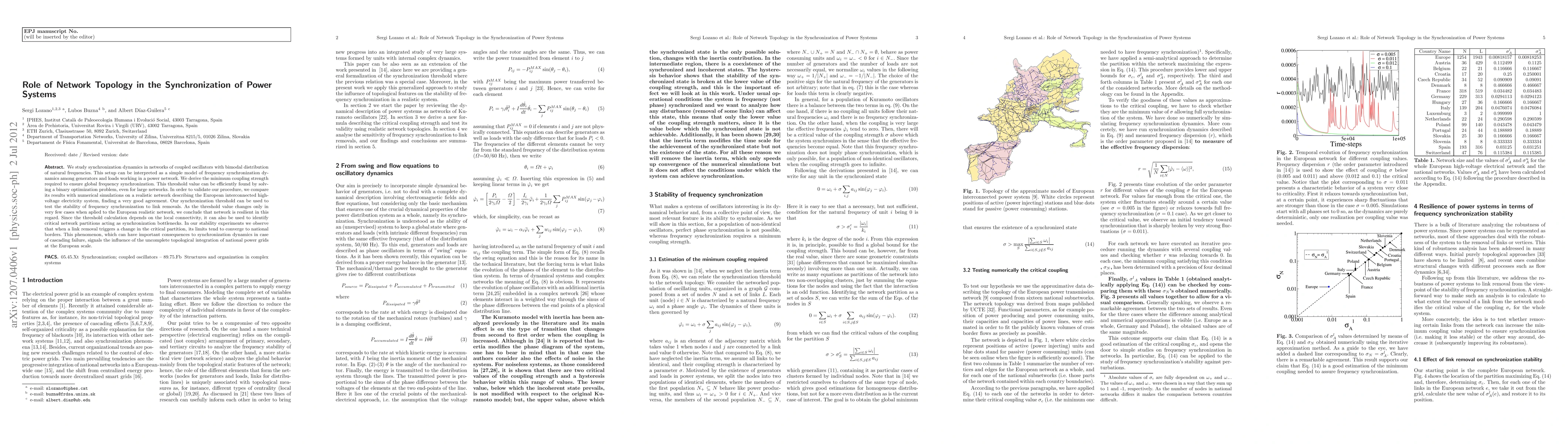 This paper investigates synchronization dynamics in power networks modeled by coupled oscillators, determining the minimum coupling strength for global frequency synchronization. The study finds that the European interconnected high-voltage system is resilient to link removals, highlighting the influence of incomplete topological integration of national grids on synchronization dynamics.