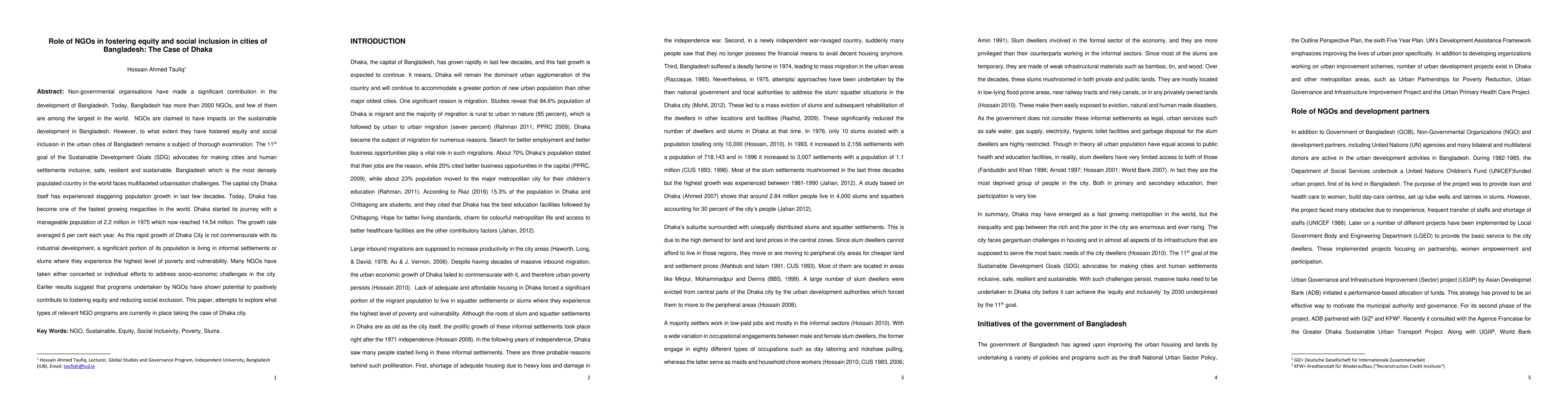 Non-governmental organisations have made a significant contribution in the development of Bangladesh. Today, Bangladesh has more than 2000 NGOs, and few of them are among the largest in the world. NGOs are claimed to have impacts on the sustainable development in Bangladesh. However, to what extent they have fostered equity and social inclusion in the urban cities of Bangladesh remains a subject of thorough examination. The 11th goal of the Sustainable Development Goals (SDG) advocates for making cities and human settlements inclusive, safe, resilient and sustainable. Bangladesh which is the most densely populated country in the world faces multifaceted urbanization challenges. The capital city Dhaka itself has experienced staggering population growth in last few decades. Today, Dhaka has become one of the fastest growing megacities in the world. Dhaka started its journey with a manageable population of 2.2 million in 1975 which now reached 14.54 million. The growth rate averaged 6 per cent each year. As this rapid growth of Dhaka City is not commensurate with its industrial development, a significant portion of its population is living in informal settlements or slums where they experience the highest level of poverty and vulnerability. Many NGOs have taken either concerted or individual efforts to address socio-economic challenges in the city. Earlier results suggest that programs undertaken by NGOs have shown potential to positively contribute to fostering equity and reducing social exclusion. This paper, attempts to explore what types of relevant NGO programs are currently in place taking the case of Dhaka city.