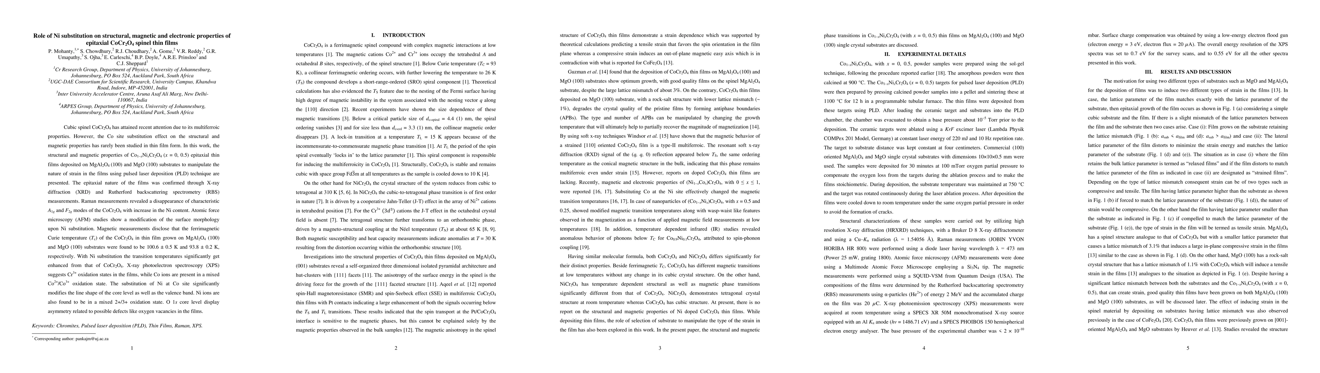 This study investigates the effects of Ni substitution for Co in CoCr2O4 spinel thin films, focusing on their structural, magnetic, and electronic properties. Epitaxial thin films of Co1-xNixCr2O4 (x = 0, 0.5) were deposited on MgAl2O4 and MgO substrates, revealing enhanced ferrimagnetic Curie temperatures and changes in surface morphology and electronic structure due to Ni substitution.