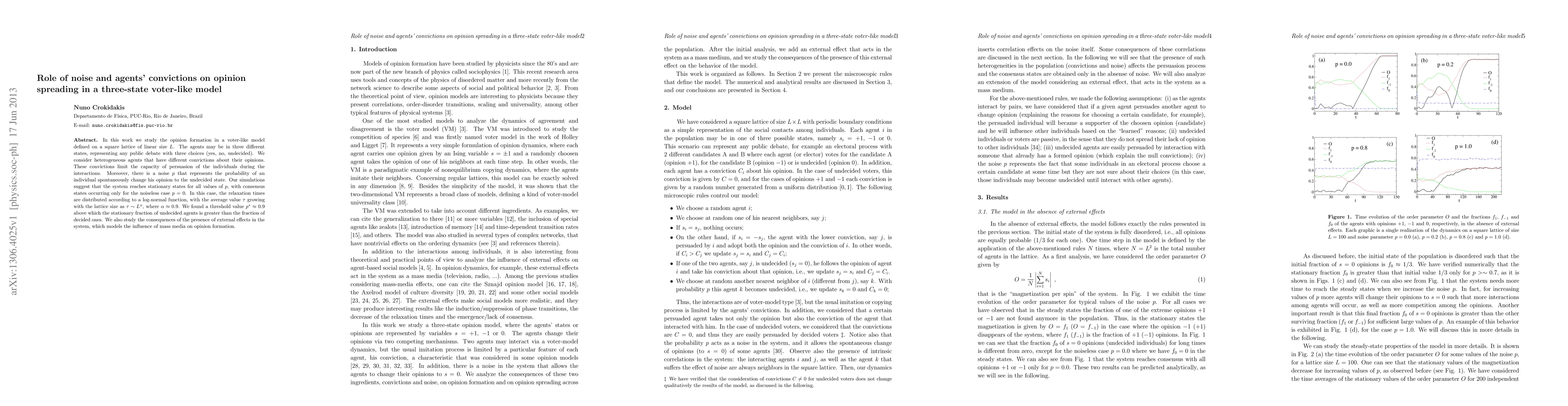 In this work we study the opinion formation in a voter-like model defined on a square lattice of linear size $L$. The agents may be in three different states, representing any public debate with three choices (yes, no, undecided). We consider heterogeneous agents that have different convictions about their opinions. These convictions limit the capacity of persuasion of the individuals during the interactions. Moreover, there is a noise $p$ that represents the probability of an individual spontaneously change his opinion to the undecided state. Our simulations suggest that the system reaches stationary states for all values of $p$, with consensus states occurring only for the noiseless case $p=0$. In this case, the relaxation times are distributed according to a log-normal function, with the average value $\tau$ growing with the lattice size as $\tau\sim L^{\alpha}$, where $\alpha\approx$ 0.9. We found a threshold value $p^{*}\approx$ 0.9 above which the stationary fraction of undecided agents is greater than the fraction of decided ones. We also study the consequences of the presence of external effects in the system, which models the influence of mass media on opinion formation.