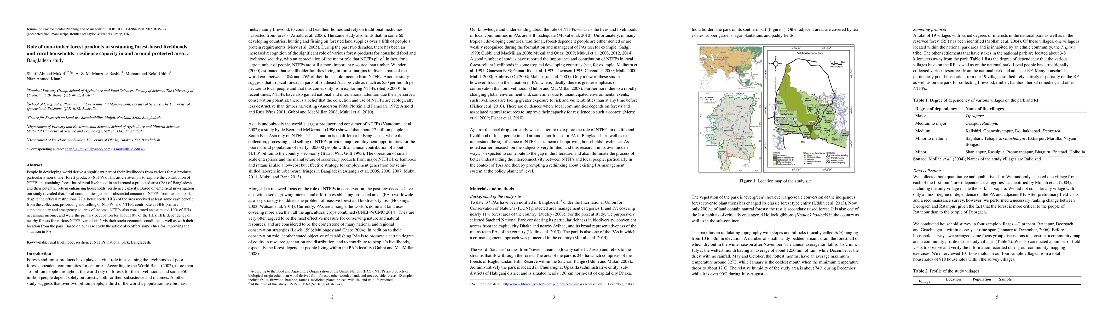 People in developing world derive a significant part of their livelihoods from various forest products, particularly non-timber forest products. This article attempts to explore the contribution of NTFPs in sustaining forest-based rural livelihood in and around a protected area of Bangladesh, and their potential role in enhancing households resilience capacity. Based on empirical investigation our study revealed that, local communities gather a substantial amount of NTFPs from national park despite the official restrictions. 27 percent households of the area received at least some cash benefit from the collection, processing and selling of NTFPs, and NTFPs contribute as HHs primary, supplementary and emergency sources of income. NTFPs also constituted an estimated 19 percent of HHs net annual income, and were the primary occupation for about 18 percent of the HHs. HHs dependency on nearby forests for various NTFPs varied vis-a-vis their socio-economic condition as well as with their location from the park. Based on our case study the article also offers some clues for improving the situation in PA.