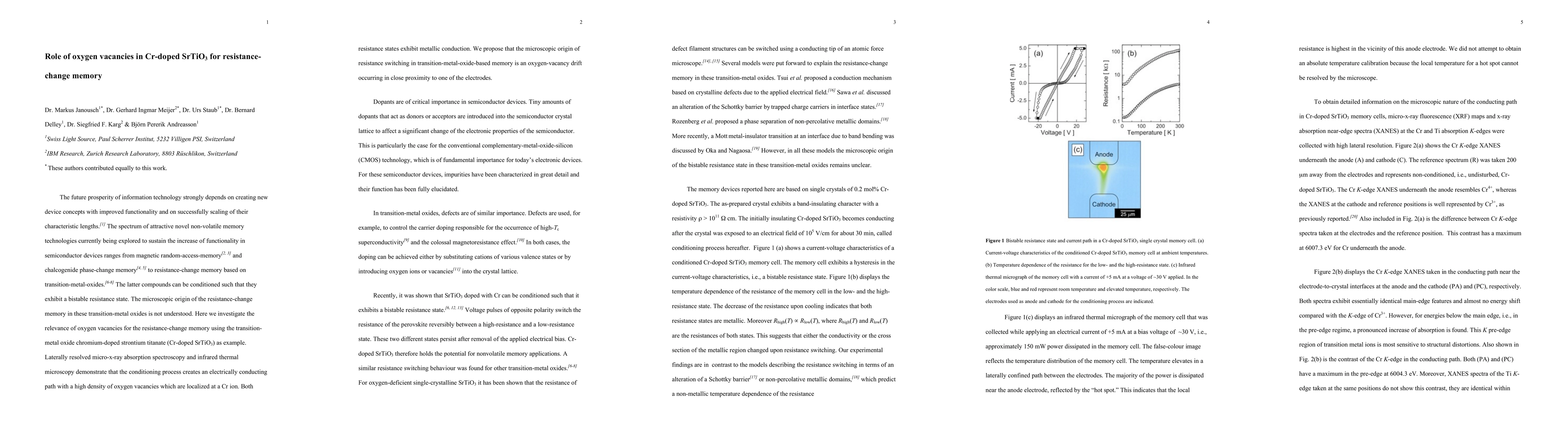 This study investigates the role of oxygen vacancies in Cr-doped SrTiO3 for resistance-change memory applications, revealing that the resistance switching is primarily due to oxygen-vacancy drift near one electrode, using advanced spectroscopic techniques.