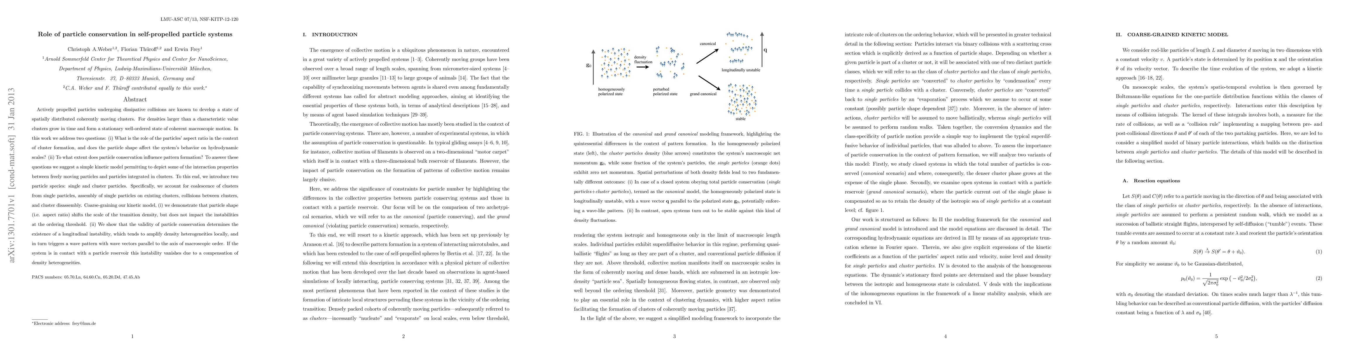Actively propelled particles undergoing dissipative collisions are known to develop a state of spatially distributed coherently moving clusters. For densities larger than a characteristic value clusters grow in time and form a stationary well-ordered state of coherent macroscopic motion. In this work we address two questions: (i) What is the role of the particles' aspect ratio in the context of cluster formation, and does the particle shape affect the system's behavior on hydrodynamic scales? (ii) To what extent does particle conservation influence pattern formation? To answer these questions we suggest a simple kinetic model permitting to depict some of the interaction properties between freely moving particles and particles integrated in clusters. To this end, we introduce two particle species: single and cluster particles. Specifically, we account for coalescence of clusters from single particles, assembly of single particles on existing clusters, collisions between clusters, and cluster disassembly. Coarse-graining our kinetic model, (i) we demonstrate that particle shape (i.e. aspect ratio) shifts the scale of the transition density, but does not impact the instabilities at the ordering threshold. (ii) We show that the validity of particle conservation determines the existence of a longitudinal instability, which tends to amplify density heterogeneities locally, and in turn triggers a wave pattern with wave vectors parallel to the axis of macroscopic order. If the system is in contact with a particle reservoir this instability vanishes due to a compensation of density heterogeneities.