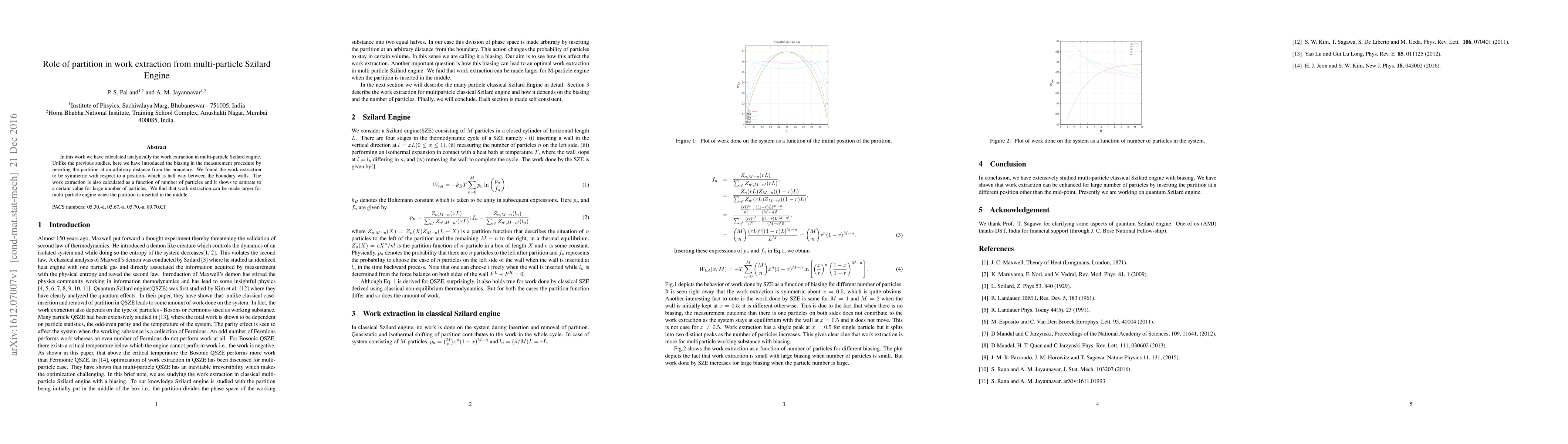 This paper analytically calculates work extraction in a multi-particle Szilard engine, introducing a partition at an arbitrary distance from the boundaries. It finds that work extraction is maximized when the partition is centered, and saturates for a large number of particles.