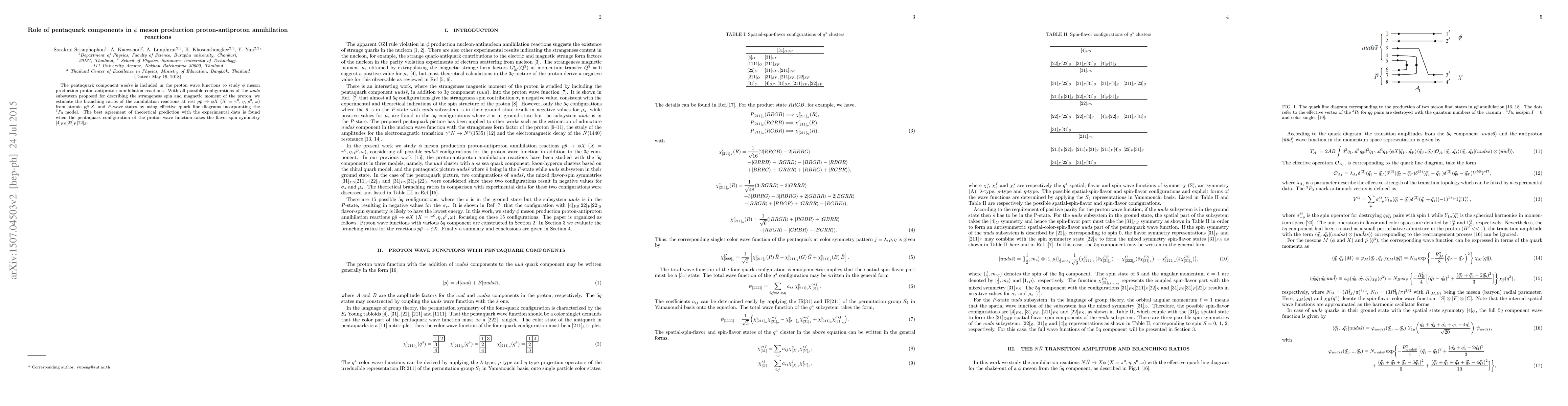 The pentaquark component is included in the proton wave functions to study phi meson production proton-antiproton annihilation reactions. With all possible configurations of the uuds subsystem proposed for describing the strangeness spin and magnetic moment of the proton, we estimate the branching ratios of the annihilation reactions at rest proton-antiproton to phi + X (X=pi, eta, rho, omega) from atomic proton-antiproton S- and P-wave states by using effective quark line diagrams incorporating the 3P0 model. The best agreement of theoretical prediction with the experimental data is found when the pentaquark configuration of the proton wave function takes the flavor-spin symmetry, [4]_FS [22]_F [22]_S.