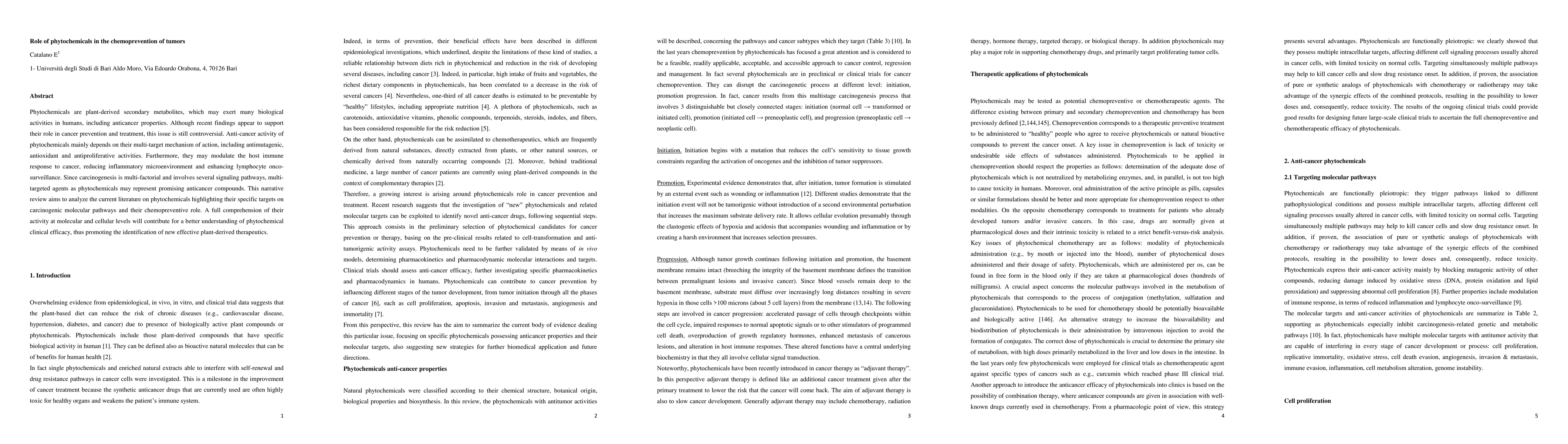 Phytochemicals are plant-derived secondary metabolites, which may exert many biological activities in humans, including anticancer properties. Although recent findings appear to support their role in cancer prevention and treatment, this issue is still controversial. Anti-cancer activity of phytochemicals mainly depends on their multi-target mechanism of action, including antimutagenic, antioxidant and antiproliferative activities. Furthermore, they may modulate the host immune response to cancer, reducing inflammatory microenvironment and enhancing lymphocyte onco-surveillance. Since carcinogenesis is multi-factorial and involves several signaling pathways, multi-targeted agents as phytochemicals may represent promising anticancer compounds. This narrative review aims to analyze the current literature on phytochemicals highlighting their specific targets on carcinogenic molecular pathways and their chemopreventive role. A full comprehension of their activity at molecular and cellular levels will contribute for a better understanding of phytochemical clinical efficacy, thus promoting the identification of new effective plant-derived therapeutics.