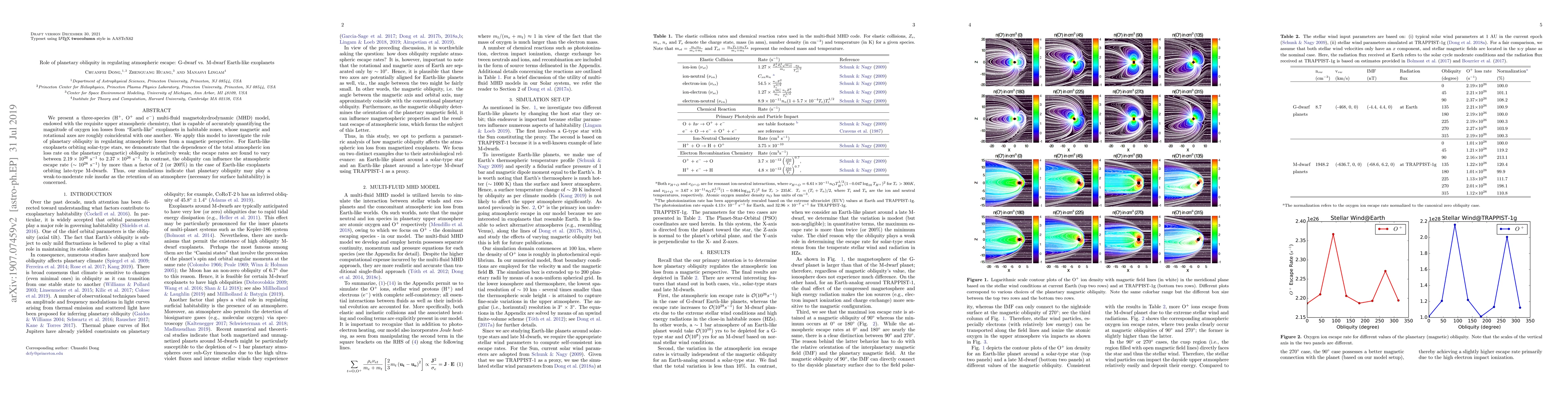 This paper uses a multi-fluid MHD model to quantify atmospheric ion losses from Earth-like exoplanets in habitable zones, finding that planetary obliquity has a relatively weak effect on atmospheric escape rates for G-dwarf systems but a significant influence on M-dwarf systems.