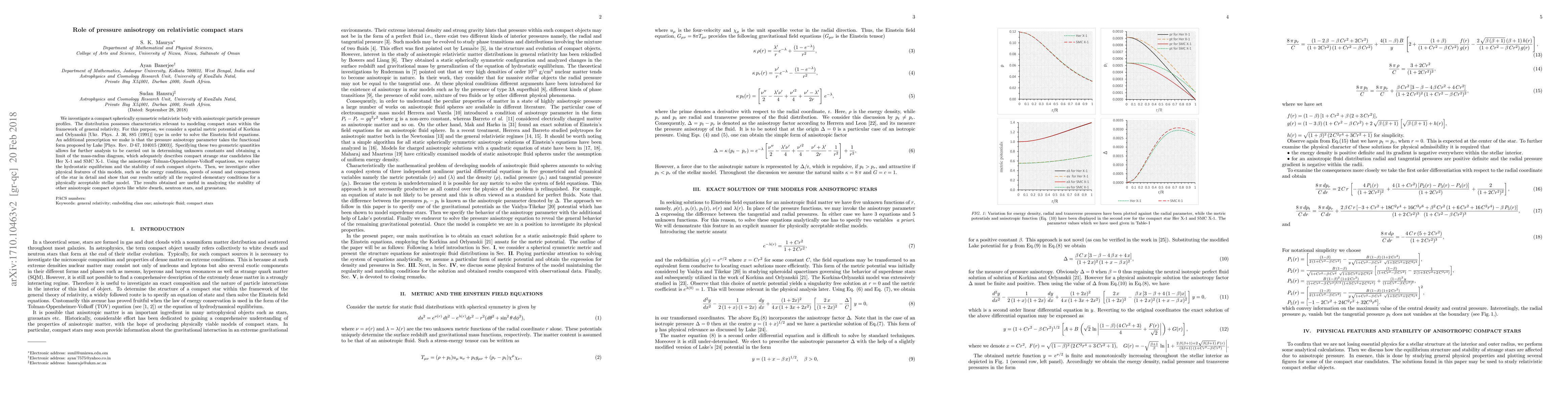 We investigate a compact spherically symmetric relativistic body with anisotropic particle pressure profiles. The distribution possesses characteristics relevant to modeling compact stars within the framework of general relativity. For this purpose, we consider a spatial metric potential of Korkina and Orlyanskii [Ukr. Phys. J. 36, 885 (1991)] type in order to solve the Einstein field equations. An additional prescription we make is that the pressure anisotropy parameter takes the functional form proposed by Lake [Phys. Rev. D 67, 104015 (2003)]. Specifying these two geometric quantities allows for further analysis to be carried out in determining unknown constants and obtaining a limit of the mass-radius diagram, which adequately describes compact strange star candidates like Her X-1 and SMC X-1. Using the anisotropic Tolman-Oppenheimer-Volkoff equations, we explore the hydrostatic equilibrium and the stability of such compact objects. Then, we investigate other physical features of this models, such as the energy conditions, speeds of sound and compactness of the star in detail and show that our results satisfy all the required elementary conditions for a physically acceptable stellar model. The results obtained are useful in analyzing the stability of other anisotropic compact objects like white dwarfs, neutron stars, and gravastars.