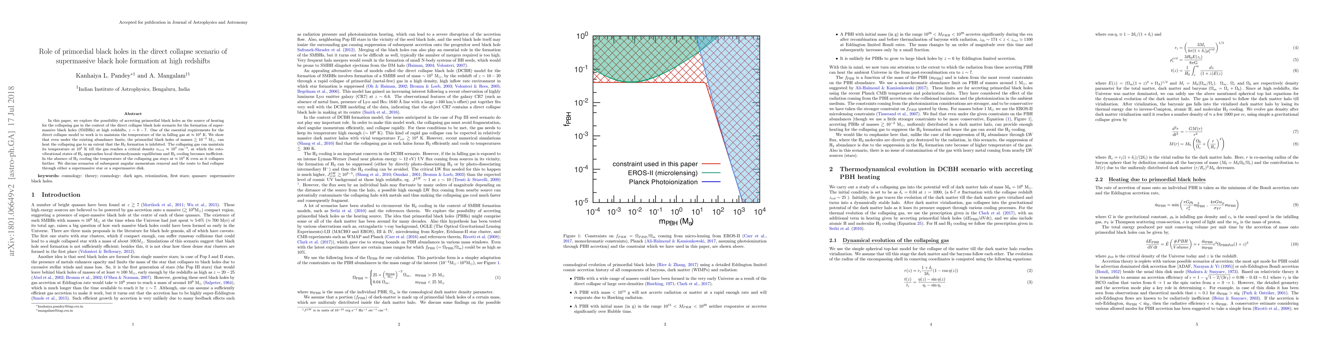 In this paper, we explore the possibility of accreting primordial black holes as the source of heating for the collapsing gas in the context of the direct collapse black hole scenario for the formation of super-massive black holes (SMBHs) at high redshifts, $z\sim 6-7$. One of the essential requirements for the direct collapse model to work is to maintain the temperature of the in falling gas at $\approx 10^4$ K. We show that even under the existing abundance limits, the primordial black holes of masses $\gtrsim 10^{-2} \ {\rm M}_\odot$, can heat the collapsing gas to an extent that the ${\rm H}_2$ formation is inhibited. The collapsing gas can maintain its temperature at $10^4$ K till the gas reaches a critical density $n_{crit} \approx 10^3$ cm$^{-3}$, at which the roto-vibrational states of ${\rm H}_2$ approaches local thermodynamic equilibrium and ${\rm H}_2$ cooling becomes inefficient. In the absence of ${\rm H}_2$ cooling the temperature of the collapsing gas stays at $\approx 10^4$ K even as it collapses further. We discuss scenarios of subsequent angular momentum removal and the route to find collapse through either a supermassive star or a supermassive disk.