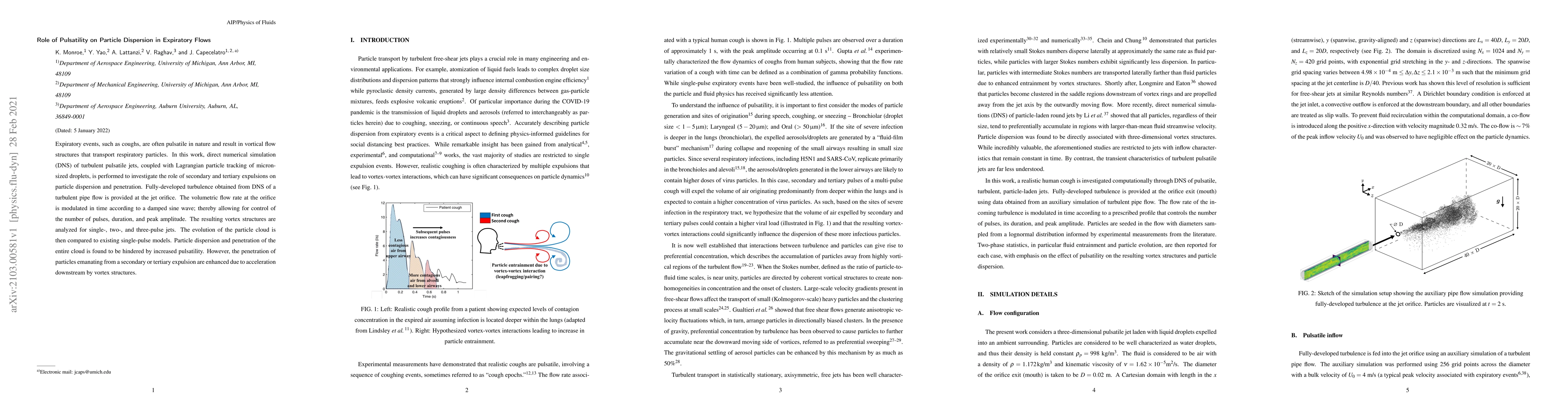 Expiratory events, such as coughs, are often pulsatile in nature and result in vortical flow structures that transport respiratory particles. In this work, direct numerical simulation (DNS) of turbulent pulsatile jets, coupled with Lagrangian particle tracking of micron-sized droplets, is performed to investigate the role of secondary and tertiary expulsions on particle dispersion and penetration. Fully-developed turbulence obtained from DNS of a turbulent pipe flow is provided at the jet orifice. The volumetric flow rate at the orifice is modulated in time according to a damped sine wave; thereby allowing for control of the number of pulses, duration, and peak amplitude. The resulting vortex structures are analyzed for single-, two-, and three-pulse jets. The evolution of the particle cloud is then compared to existing single-pulse models. Particle dispersion and penetration of the entire cloud is found to be hindered by increased pulsatility. However, the penetration of particles emanating from a secondary or tertiary expulsion are enhanced due to acceleration downstream by vortex structures.
