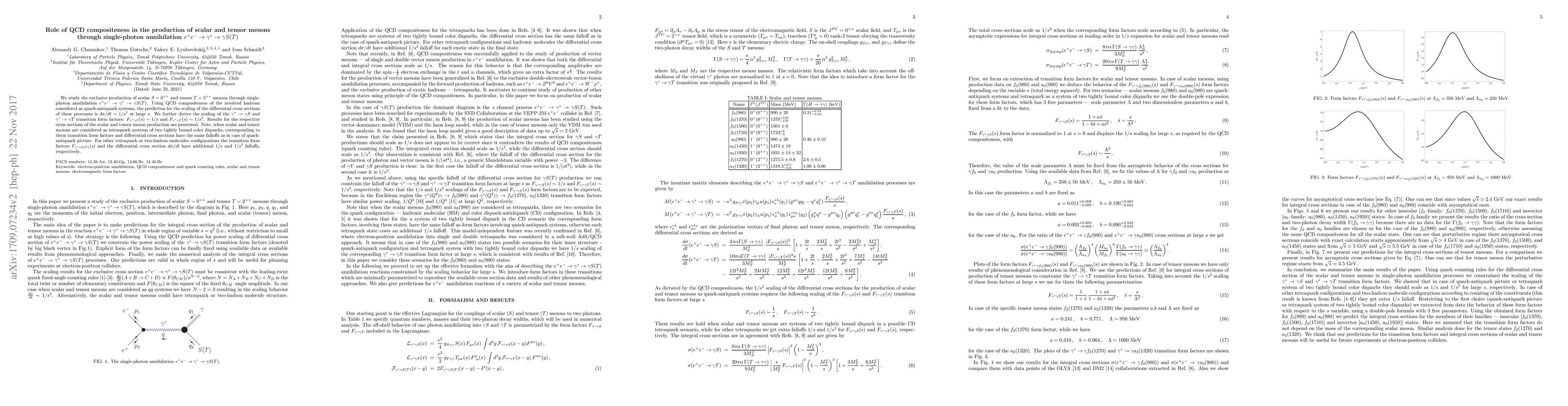 This paper explores the production of scalar and tensor mesons via single-photon annihilation in $e^+ e^-$ collisions, predicting a $1/s^3$ scaling for differential cross sections at large $s$. It also derives transition form factors scaling as $1/s$ and $1/s^2$ for $\gamma^\ast \to \gamma S$ and $\gamma^\ast \to \gamma T$, respectively.
