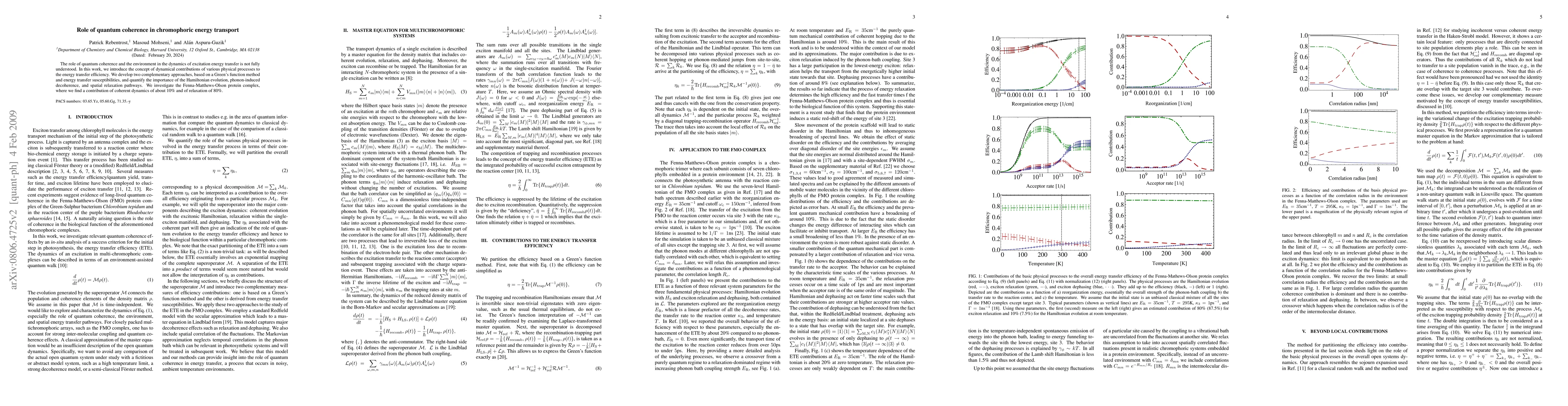 This paper explores quantum coherence's role in chromophoric energy transfer, employing Green's function and susceptibility methods to analyze the Fenna-Matthews-Olson protein complex. It finds that coherent dynamics contribute about 10% to energy transfer efficiency, with relaxation pathways accounting for 80%.