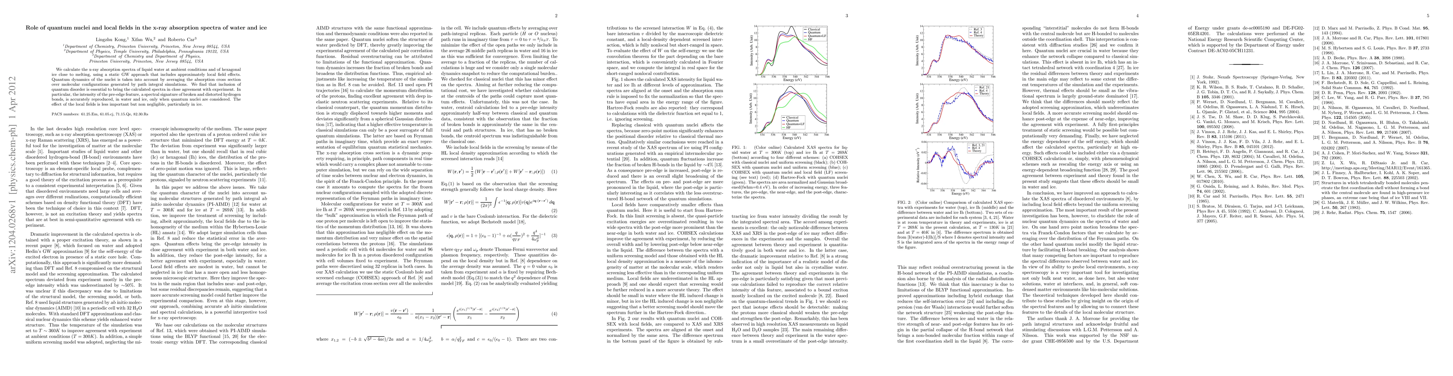 This study uses a static GW approach to calculate x-ray absorption spectra of water and ice, incorporating quantum nuclear dynamics and local field effects. Quantum disorder is crucial for accurate agreement with experimental data, especially for the pre-edge feature indicative of hydrogen bond distortions.