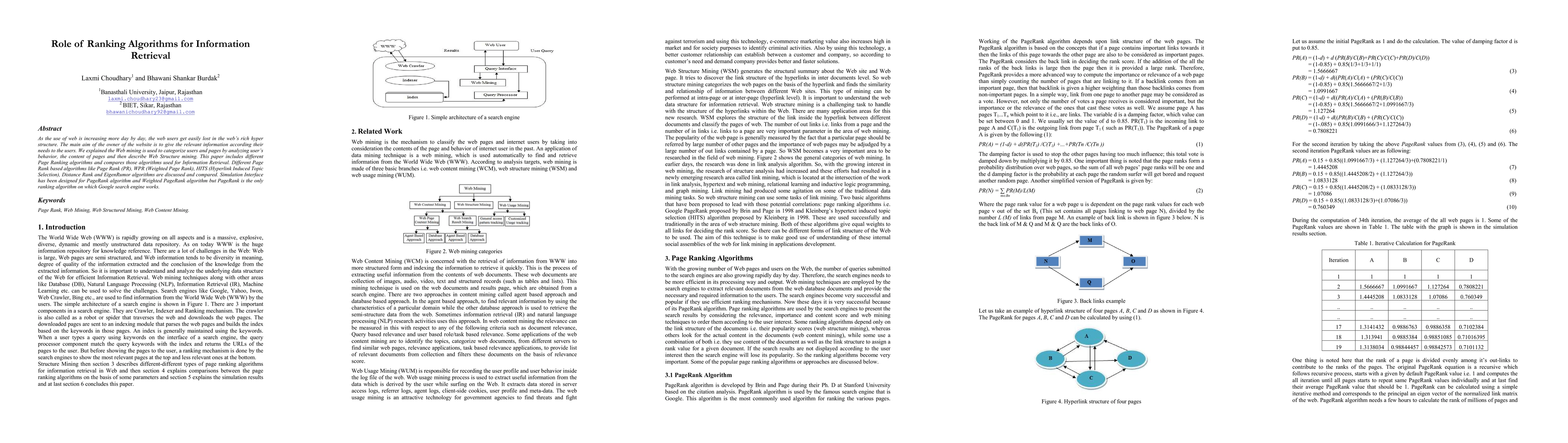 As the use of web is increasing more day by day, the web users get easily lost in the web's rich hyper structure. The main aim of the owner of the website is to give the relevant information according their needs to the users. We explained the Web mining is used to categorize users and pages by analyzing user's behavior, the content of pages and then describe Web Structure mining. This paper includes different Page Ranking algorithms and compares those algorithms used for Information Retrieval. Different Page Rank based algorithms like Page Rank (PR), WPR (Weighted Page Rank), HITS (Hyperlink Induced Topic Selection), Distance Rank and EigenRumor algorithms are discussed and compared. Simulation Interface has been designed for PageRank algorithm and Weighted PageRank algorithm but PageRank is the only ranking algorithm on which Google search engine works.