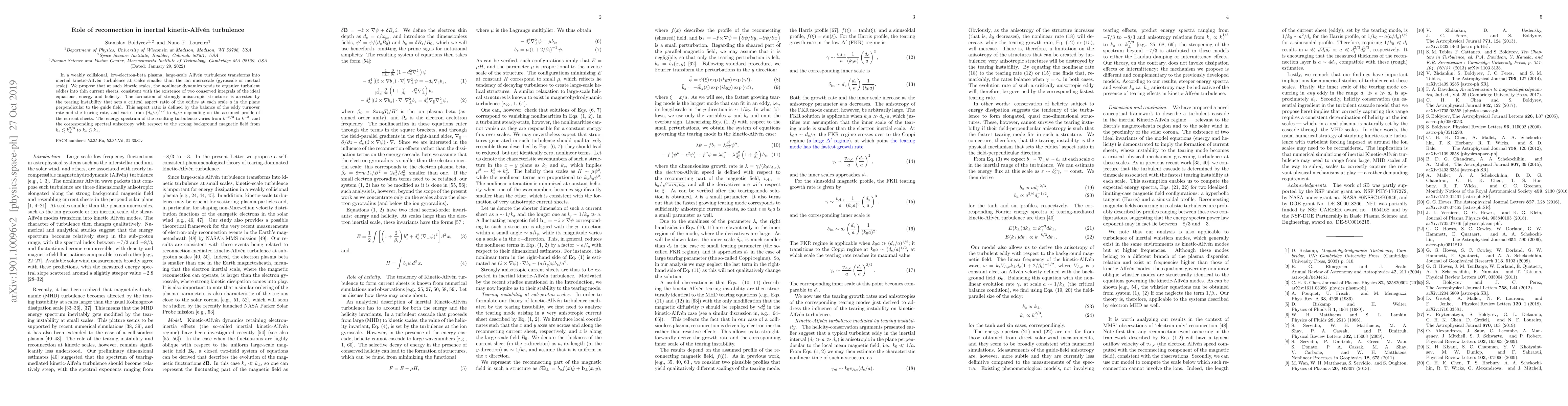 This paper explores the transformation of Alfvén turbulence into inertial kinetic-Alfvén turbulence in low-electron-beta plasmas, proposing that the tearing instability organizes turbulent eddies into thin current sheets, leading to a spectrum ranging from $k^{-8/3}$ to $k^{-3}$. The aspect ratio of these eddies balances the eddy turnover rate with the tearing rate.